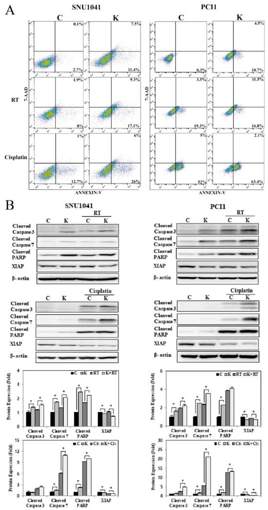 Effects of KRT1 knockdown on radiosensitivity and chemosensitivity in human head and neck cancer cells: (A) The combination of KRT1 knockdown with either 10 Gy radiation or 10 ug/mL cisplatin resulted in increased apoptosis in SNU-1041 and PCl1 cells relative to control cells treated with 10 Gy radiation or 10 ug/mL cisplatin alone. (B) KRT1-knockdown cells exhibited higher levels of cleaved caspase-3, caspase-7, and cleaved PARP expression than control cells after treatment with 10 Gy radiation or 10 ug/mL cisplatin. C, negative control siRNA-transfected cells; K, KRT1-specific siRNA-transfected cells; Cis, cisplatin; siRNA, small interfering RNA; RT, radiation; PARP, poly(ADP-ribose) polymerase; XIAP, X-linked inhibitor of apoptosis protein; 7-AAD, 7-amino-actinomycin D; * p < 0.05.