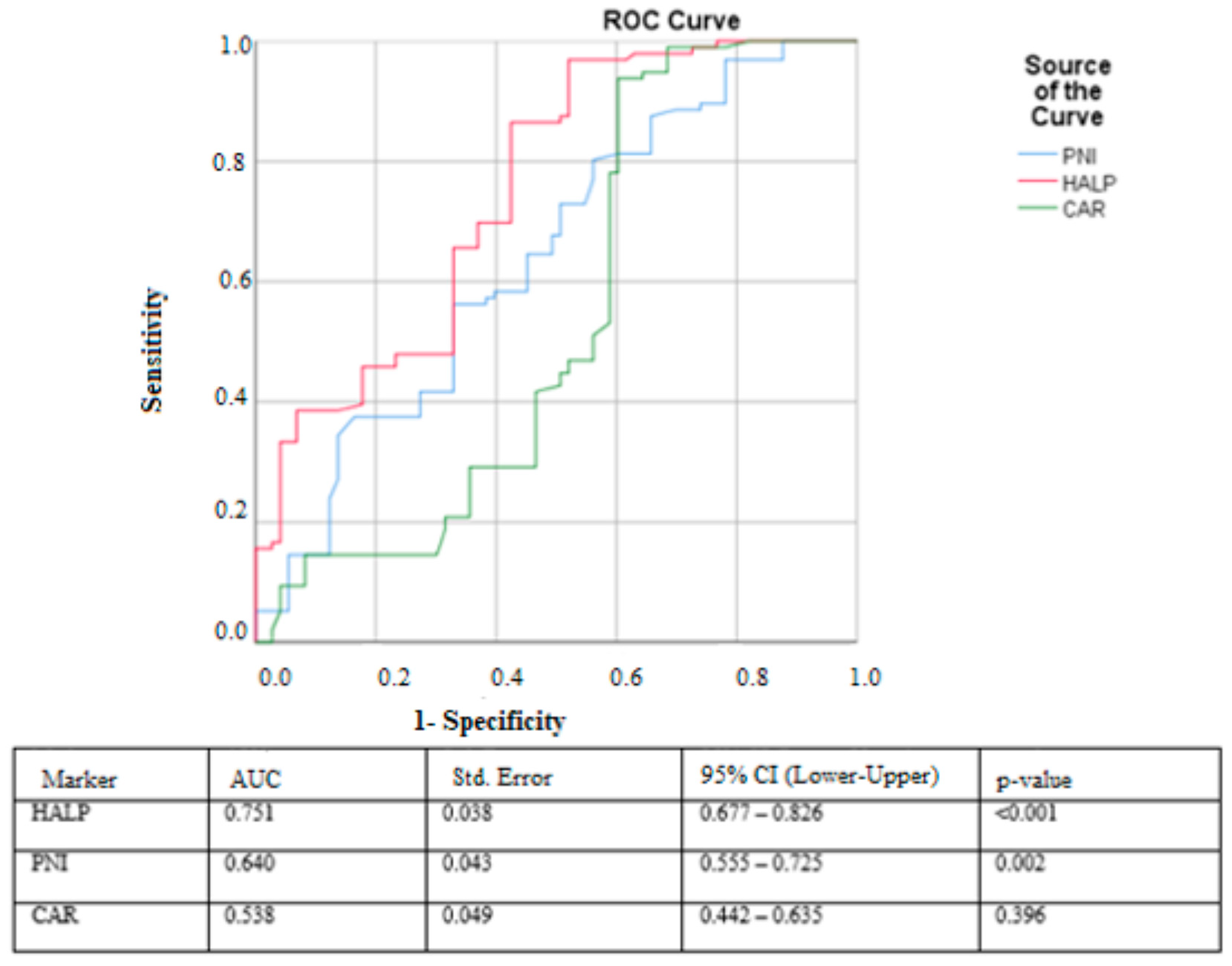 p < 0.001). The optimal cut-off value for HALP was 5.83, yielding a sensitivity of 96.9% and a specificity of 52.1%. The PNI score showed moderate predictive ability, with an AUC of 0.640 (95% CI: 0.555–0.725,