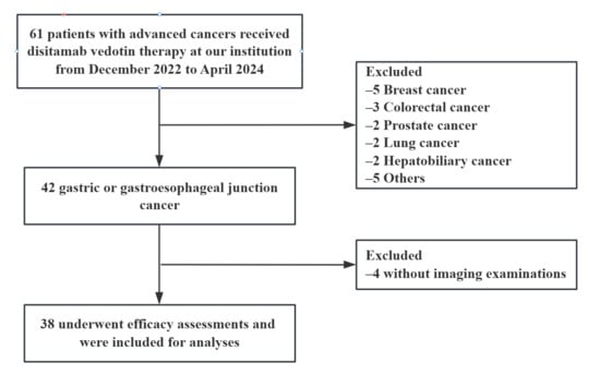 We retrospectively collected the clinical data of patients who were administered disitamab vedotin at our institution between December 2022 and April 2024. Only patients who consented and signed the consent form were included. The inclusion criteria were as follows: advanced GC/GEJC with metastases; HER2 overexpression at initial diagnosis (IHC 3+ or 2+, regardless of FISH results); received at least two cycles of disitamab vedotin; underwent imaging assessments. Patients were excluded if they met the following criteria: received only one cycle of disitamab vedotin; did not undergo imaging examination; or lacked clinical data. The study was approved by the Ethics Committee of Nanjing Drum Tower Hospital (approval code: 2024-504-01; approval date: 22 August 2024). All procedures were performed following the ethical guidelines of the Declaration of Helsinki.