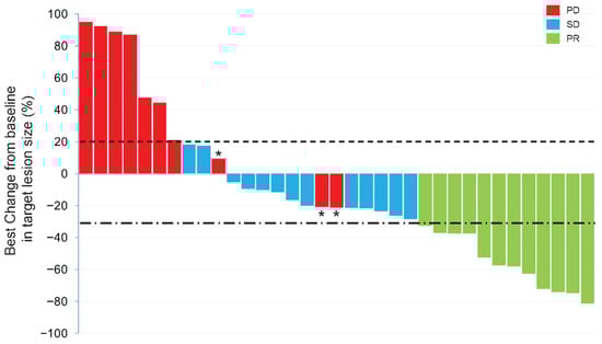 The best response change from baseline in the sum of the diameters of target lesions. The dotted horizontal line indicates the +20% threshold (PD), and the dash-dotted horizontal line indicates the −30% threshold (PR). * means patients had at least one new lesion during the treatment. Abbreviations: PR, partial response; SD, stable disease; PD, progressive disease.