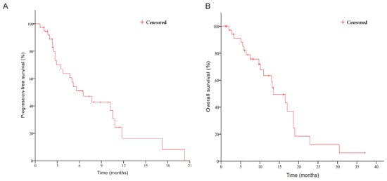 Overall, 35 of the 38 patients presented at least one measurable lesion at baseline, while an additional 3 patients had peritoneal or bone metastases. According to the RECIST version 1.1, 12 patients were evaluated as PR, 13 had SD, and 13 exhibited PD, including 6 patients with the emergence of one or more new lesions. The overall ORR and DCR were 31.6% and 65.8%, respectively (Table 2, Figure 2). In addition, we analyzed the relationship between the treatment efficacy and various baseline characteristics, such as the primary tumor location, the number of metastatic sites, prior line of treatment, HER2 status, prior anti-HER2 therapy, and concurrent treatment regimens. Subgroup analyses indicated that patients with one metastatic site achieved a higher ORR (53.3% vs. 17.4%, p = 0.022), while the DCR was comparable between groups (73.3% vs. 60.9%, p = 0.435), and no notable difference in treatment response was observed between other paired groups. Interestingly, a higher DCR was observed in patients diagnosed with GEJC compared to those with GC (100% vs. 59.3%, p = 0.054), although the underlying mechanism for this observation remains unclear.