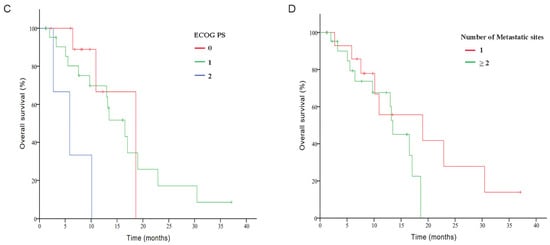 Towards the end of the follow-up period on 6 August 2024, the median PFS for the enrolled cohort was 6.5 months (95% confidence interval [CI] 3.3–9.8 months), and the median OS was 13.5 months (95% CI, 9.0–17.9 months) (Figure 3A,B). Our analysis revealed that patients with an Eastern Cooperative Oncology Group (ECOG) performance status (PS) of 0 experienced prolonged survival compared to those with an ECOG score of 1 or 2, exhibiting median OS durations of 18.6, 16.5, and 5.9 months, respectively (p = 0.009) (Figure 3C). Furthermore, patients with only a single metastatic site showed a trend toward improved overall survival in comparison to those with multiple metastatic sites (19.0 vs. 13.5 months), while this difference did not reach statistical significance (p = 0.119) (Figure 3D). No other subgroups displayed significant advantages in terms of either PFS or OS.