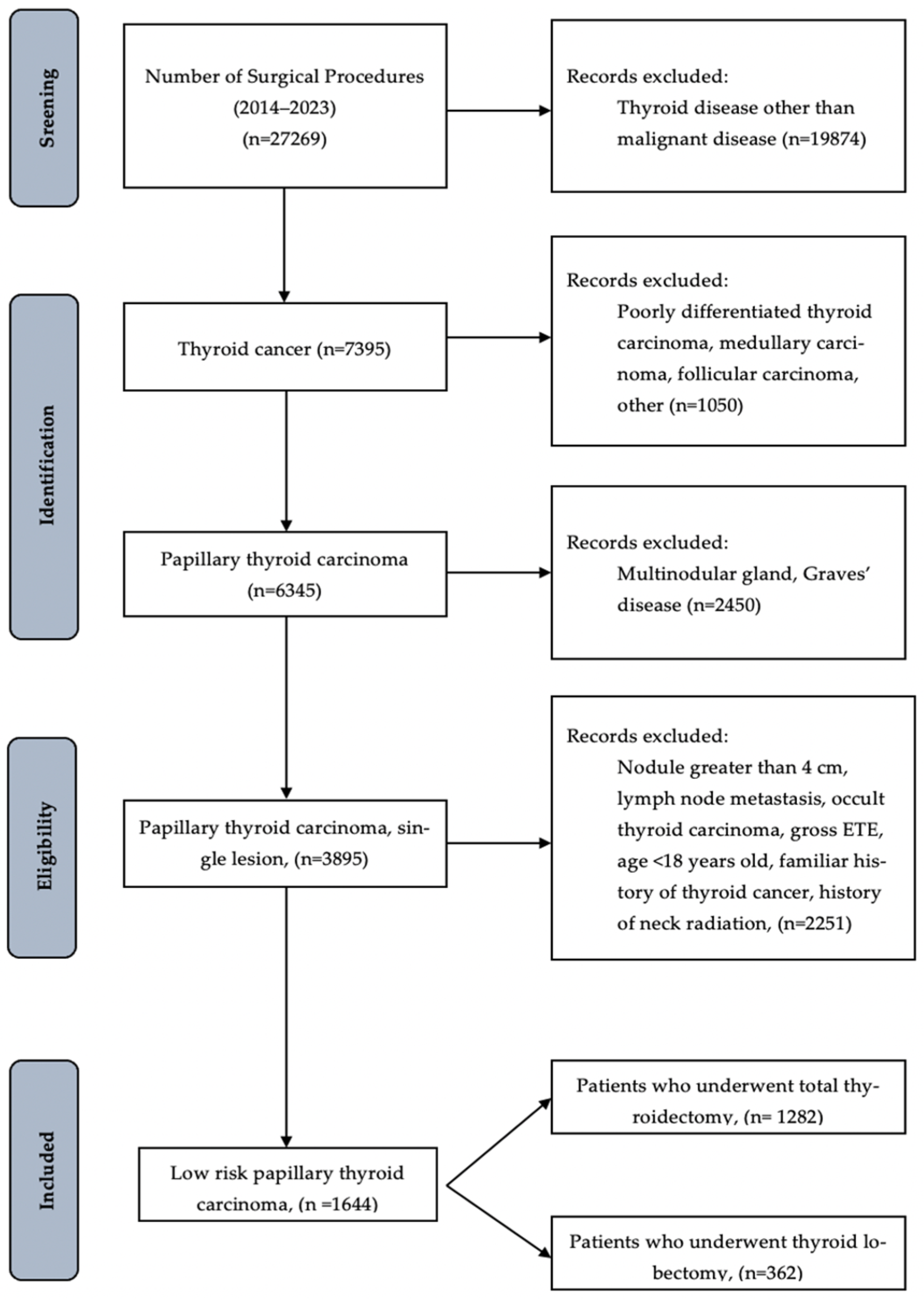 - Li, C.; Li, Q.; Shi, X.; Han, S.; Song, X.; Li, X.; Zhuang, X. Papillary thyroid microcarcinoma and papillary thyroid carcinoma: Clinical characteristics and stratification of treatment strategies. PLoS ONE 2025, 20, e0327423. [Google Scholar] [CrossRef]