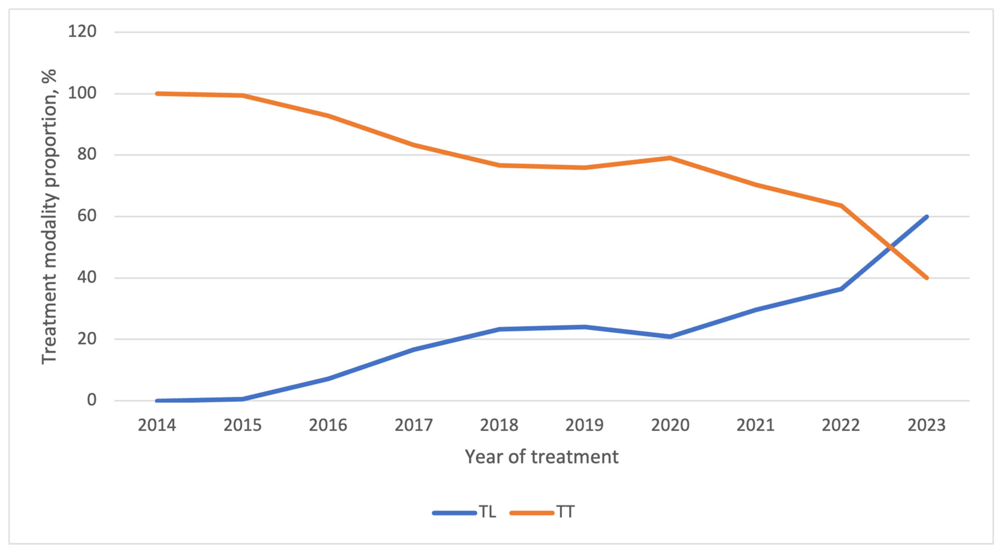 | YEAR | Number of Surgeries | TT, N (%) | TL, N (%) |