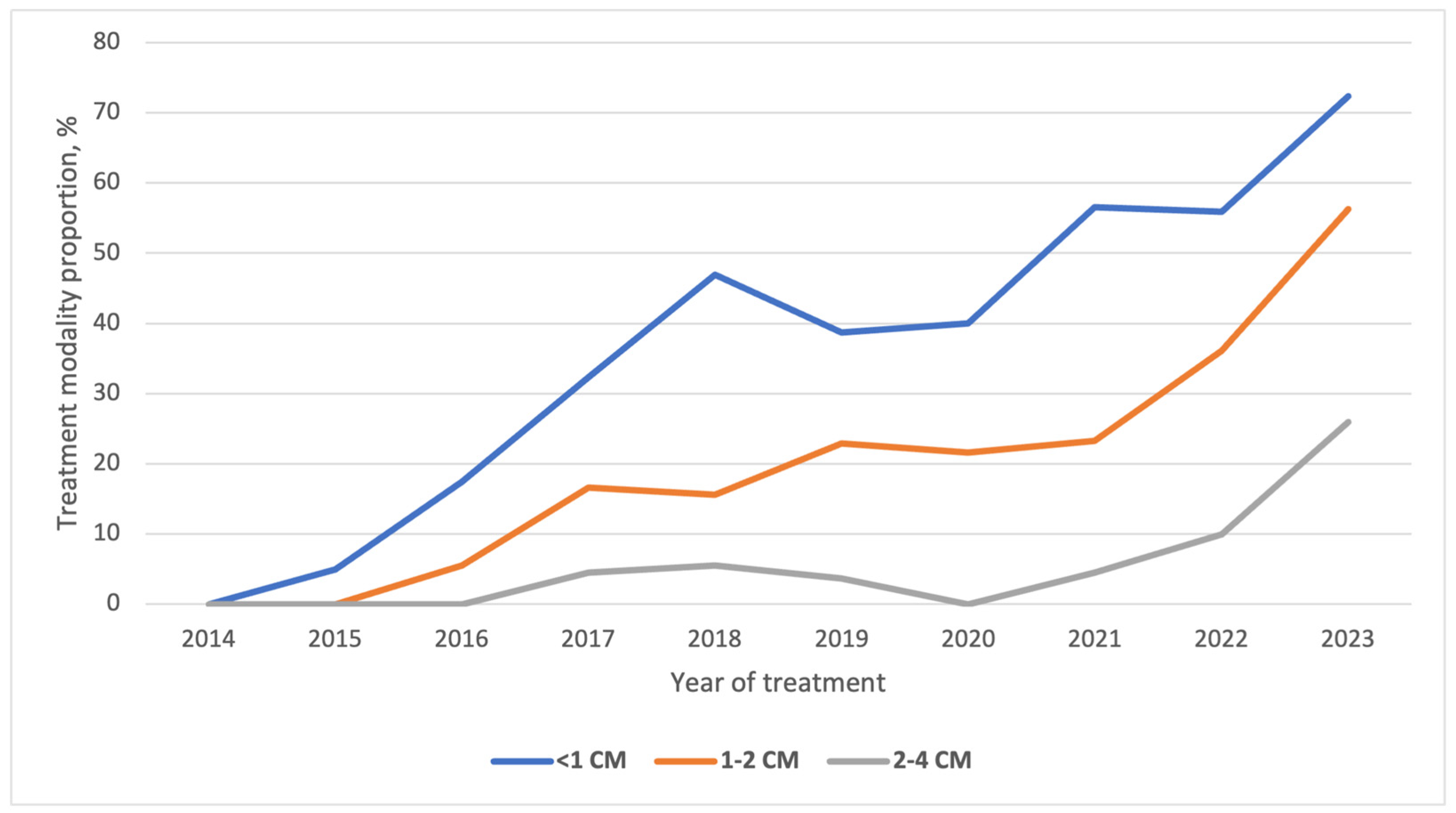 | 0–1 cm | 159 | 22 (13.8) | 0.34 |