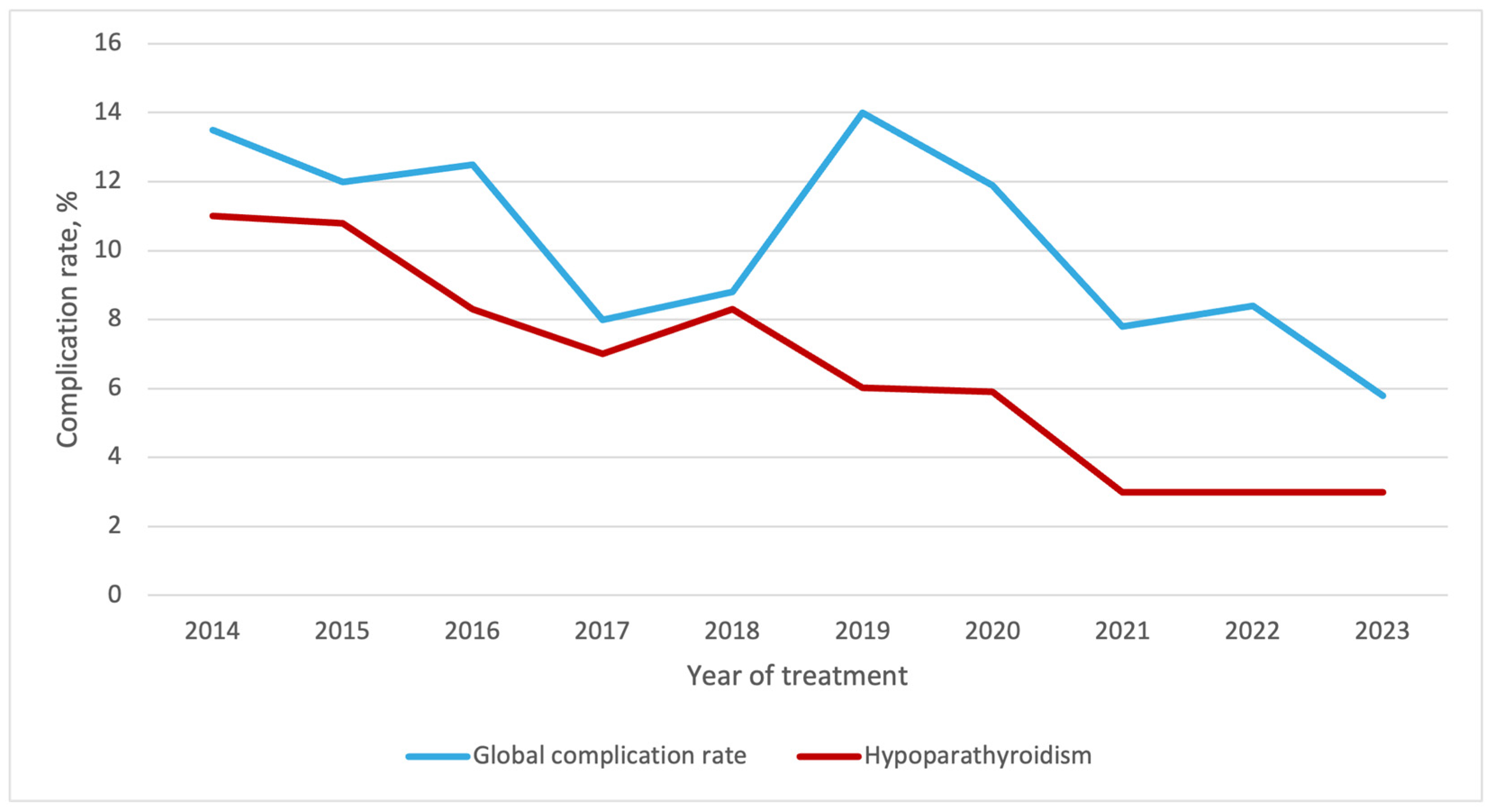 | Permanent hypocalcemia, N (%) | 23 (1.4) | 0 | 23 (1.8) | 0.03 |