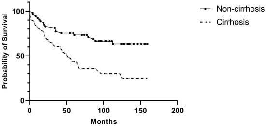 Postoperatively, major complications were significantly more common in the cirrhosis group (18.9% vs. 3.8%, p = 0.01), particularly intra-abdominal abscesses (9.4% vs. 0%, p = 0.02) and surgical site infection (15.1% vs. 1.9%, p = 0.02). The cirrhosis group also had significantly longer hospital stays (18 days vs. 10 days, p < 0.001) and higher mortality across all timeframes, including in-hospital mortality (7.5% vs. 0%, p = 0.04), 3-month mortality (9.4% vs. 0%, p = 0.02), and 60-month mortality (66% vs. 28.3%, p < 0.001). The overall survival duration was substantially shorter in cirrhotic patients (70.7 months vs. 116.8 months, p < 0.001) (Figure 1). Most mortality was related to cirrhosis.