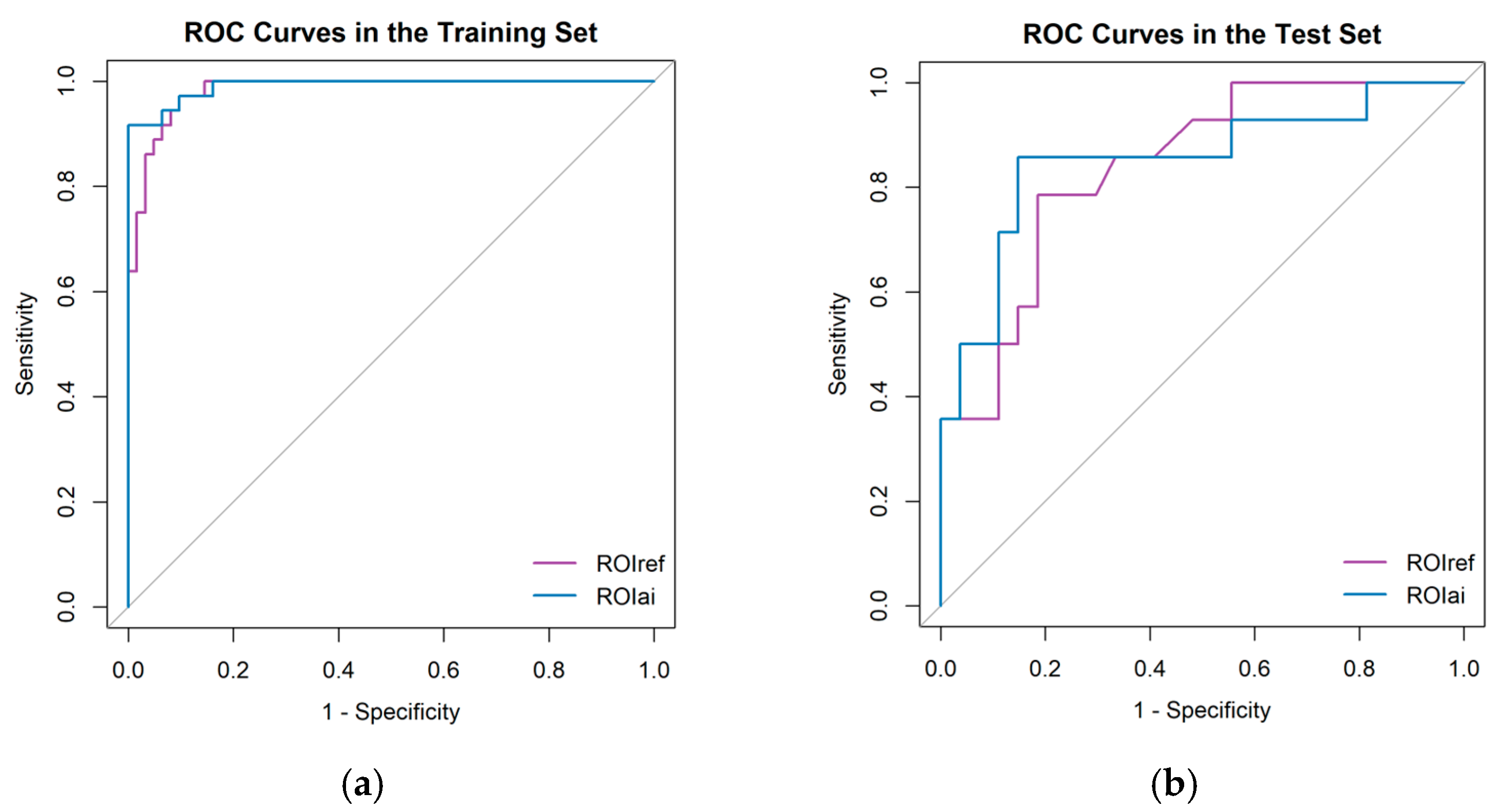 The discrimination ability of the ROIref- and ROIai-derived probability scores was quantified using receiver operating characteristic (ROC) analysis, with the area under the curve (AUC) calculated for both ROI types. Statistical differences between the AUC values were assessed using the DeLong test.