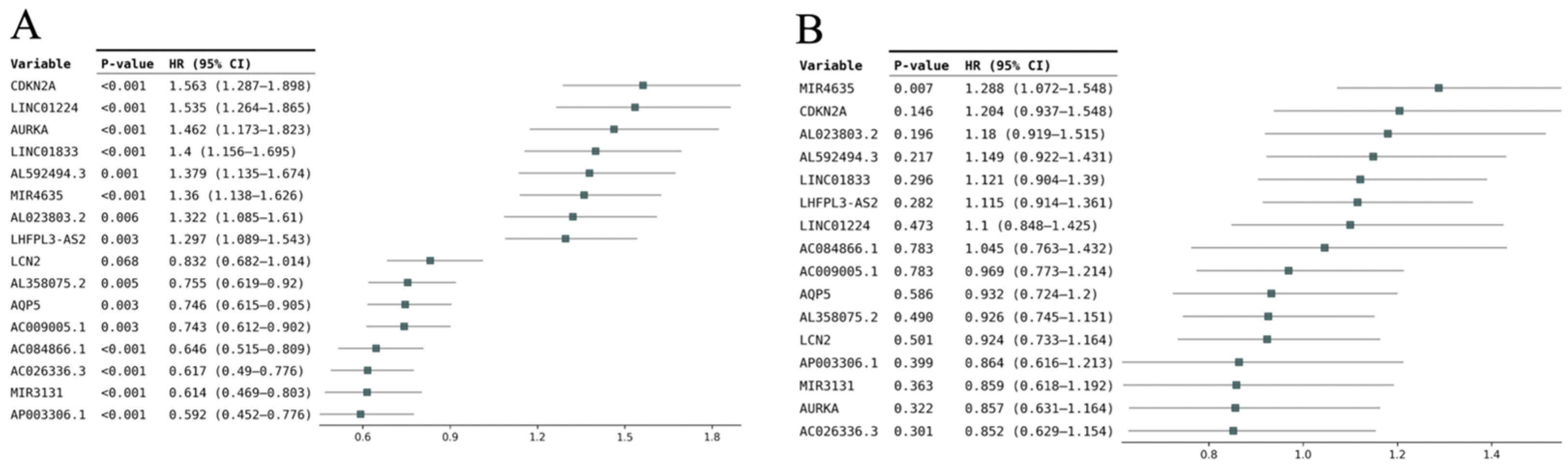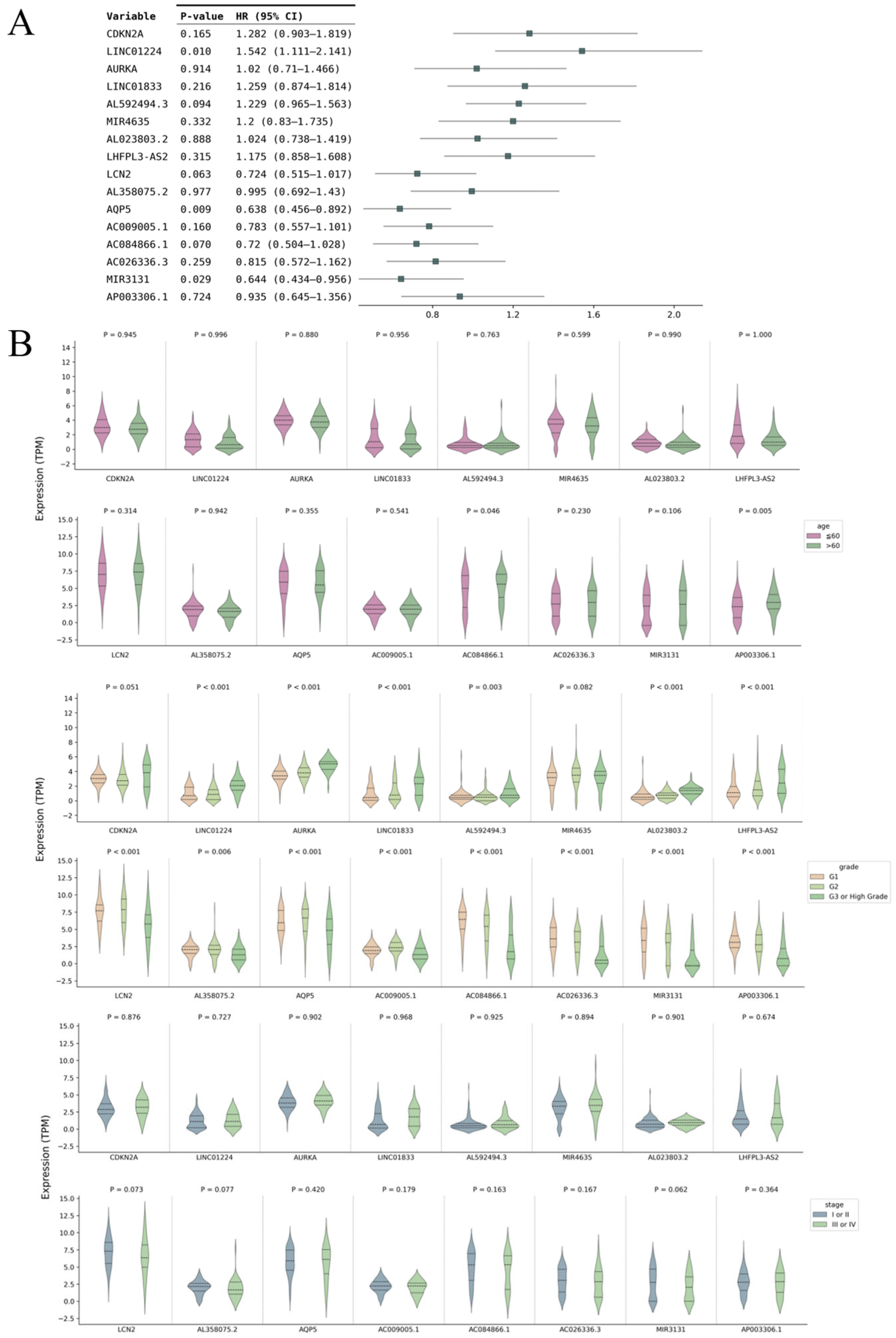 2.5. Establishment of a Prognostic Model Based on the Ferroptosis-Related lncRNA-miRNA-mRNA Signature