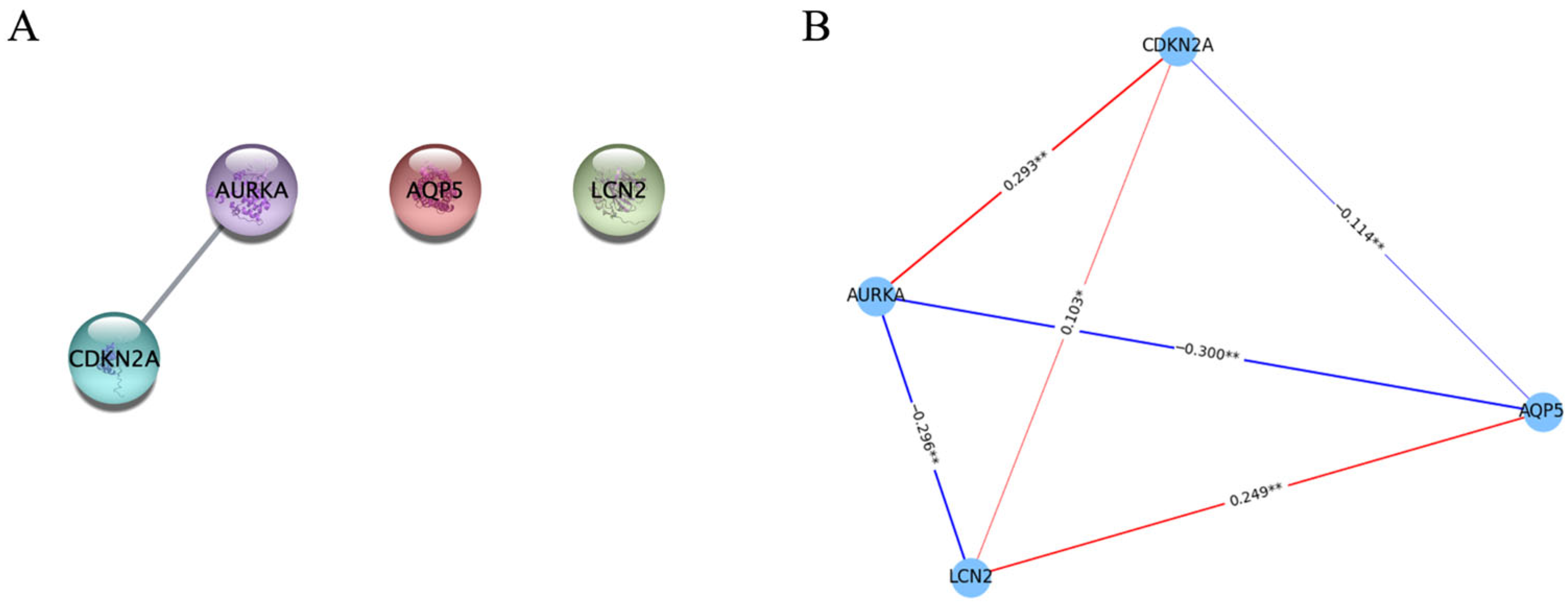 3.2. Identification of Signal Ferroptosis-Related RNAs and Construction of PPI and Correlation Networks