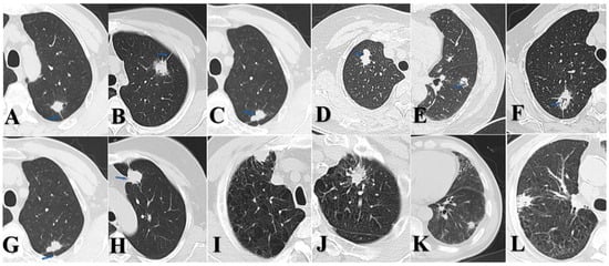 (A) p-LUSC, male, spicular sign. (B) p-LUAD, female, spicular sign. (C) p-LUSC, male, lobulation sign. (D) p-LUAD, female, lobulation sign. (E) p-LUSC, male, air bronchogram. (F) p-LUAD, female, air bronchogram. (G) p-LUSC, male, pleural indentation. (H) p-LUAD, female, pleural indentation. (I) p-LUSC, male, emphysema. (J) p-LUAD, male, emphysema. (K) p-LUSC, male, interstitial pneumonia. (L) p-LUAD, male, interstitial pneumonia.