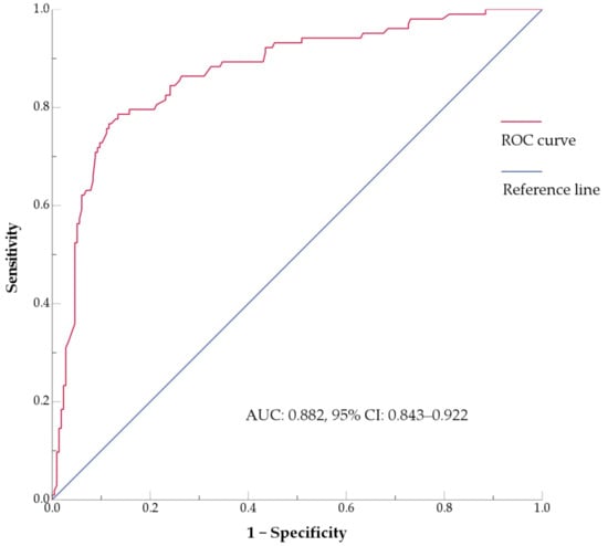 Further logistic regression analysis showed that gender ratio (p < 0.001), age (p < 0.001), smoking history (p = 0.004), lobulation sign (p < 0.001), and interstitial pneumonia (p = 0.019) were independent factors. The area under the receiver operating characteristic curve (AUC) values for the evaluated factors were as follows: gender ratio (0.661, 95% CI: 0.600–0.722), age (0.725, 95% CI: 0.665–0.784), smoking history (0.640, 95% CI: 0.574–0.706), lobulation sign (0.714, 95% CI: 0.653–0.775), and interstitial pneumonia (0.577, 95% CI: 0.508–0.647). The combined predictive model integrating these factors (Figure 2) achieved an AUC of 0.882 (95% CI: 0.843–0.922).