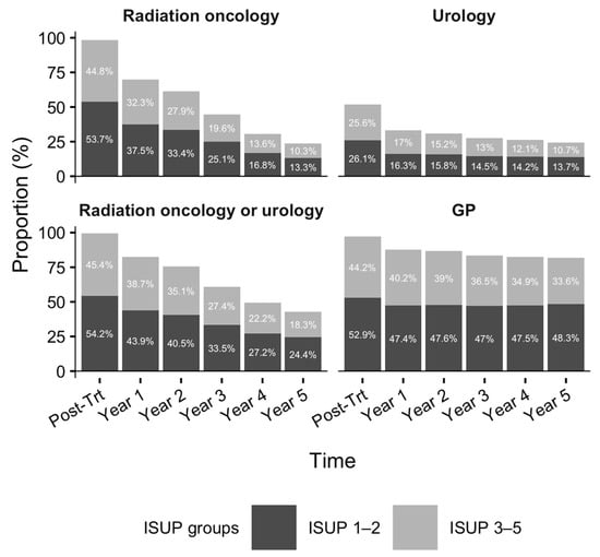 During the post-treatment phase, nearly all survivors had at least one RO (98.5%, n = 12,671) and GP (97.0%, n = 12,485) visit, while 51.7% (n = 6657) saw a urologist (Figure 2). As survivorship progressed, the proportion seeing RO providers declined by 46.2%, whereas decreases in urology (8.9%) and primary care (5.7%) visits were modest. By the fifth year of survivorship, 23.6% continued to receive RO follow-up; however, more than 50% of these were low-risk survivors (ISUP Grades 1–2). Moreover, 24.4% and 81.9% sought care from a urologist and GP, respectively.
