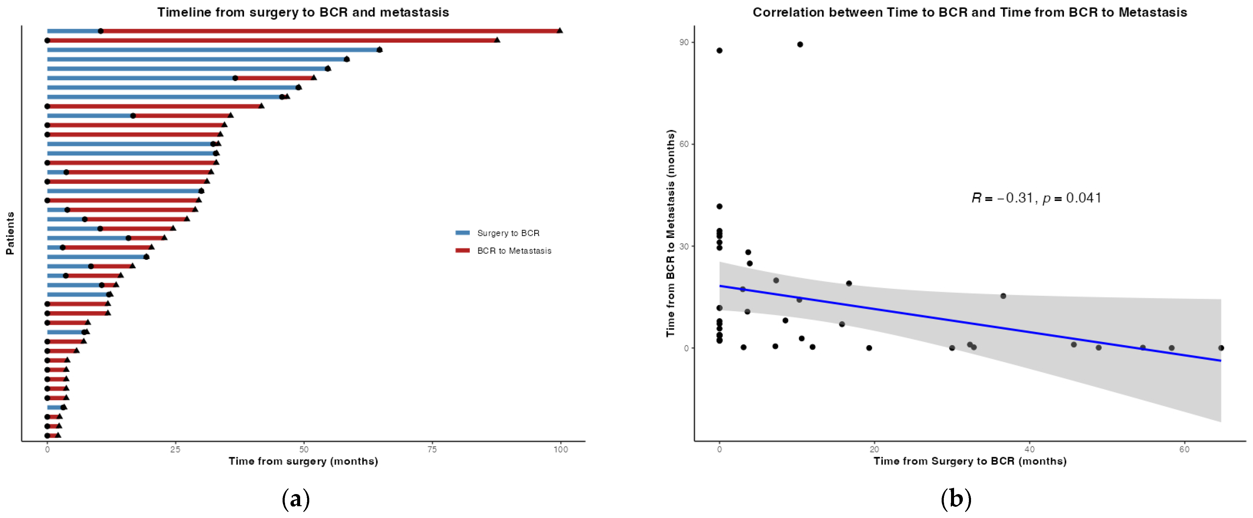 - Boorjian, S.A.; Thompson, R.H.; Tollefson, M.K.; Rangel, L.J.; Bergstralh, E.J.; Blute, M.L.; Karnes, R.J. Long-term risk of clinical progression after biochemical recurrence following radical prostatectomy: The impact of time from surgery to recurrence. Eur. Urol. 2011, 59, 893–899. [Google Scholar] [CrossRef]