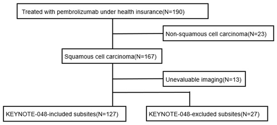 A total of 190 patients who received pembrolizumab under the national health insurance system during the study period were evaluated. Histological analysis excluded 23 patients with non-squamous cell carcinoma, leaving 167 patients with squamous cell carcinoma (Figure 1). Thirteen patients were excluded due to a lack of evaluable imaging data. Patients with primary tumors located in sites included in the KEYNOTE-048 trial (oral cavity, oropharynx, hypopharynx, and larynx) were defined as the “included site” group (n = 127). Patients with primary tumors located in sites not included in the KEYNOTE-048 trial were defined as the “excluded subsite” group (n = 27).