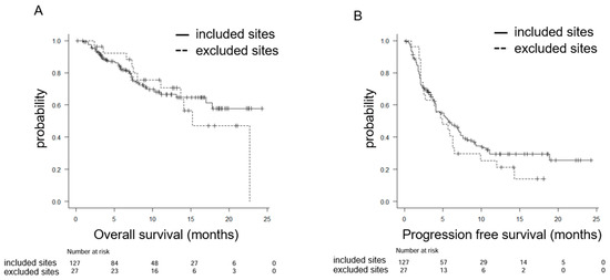 Kaplan–Meier plots for (A) overall survival (OS) and (B) progression-free survival (PFS) classified by anatomical location: included sites and excluded subsites, according to the eligibility criteria of the KEYNOTE-048 trial.