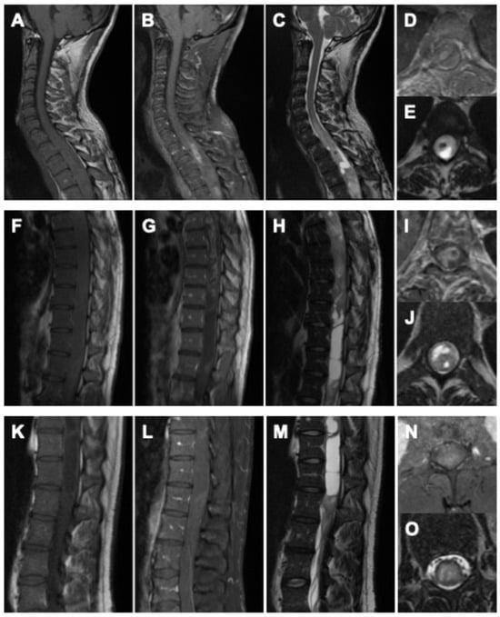 Preoperative imaging of the holocord astrocytoma. Cervical spine: (A) sagittal native T1-weighted MRI, (B) sagittal gadolinium-enhanced T1-weighted MRI, (C) sagittal native T2-weighted MRI, (D) axial gadolinium-enhanced T1-weighted MRI, and (E) axial native T2-weighted MRI. Thoracic spine: (F) sagittal native T1-weighted MRI, (G) sagittal gadolinium-enhanced T1-weighted MRI, (H) sagittal native T2-weighted MRI, (I) axial gadolinium-enhanced T1-weighted MRI, and (J) axial native T2-weighted MRI. Lumbar spine: (K) sagittal native T1-weighted MRI, (L) sagittal gadolinium-enhanced T1-weighted MRI, (M) sagittal native T2-weighted MRI, (N) axial gadolinium-enhanced T1-weighted MRI, and (O) axial native T2-weighted MRI.