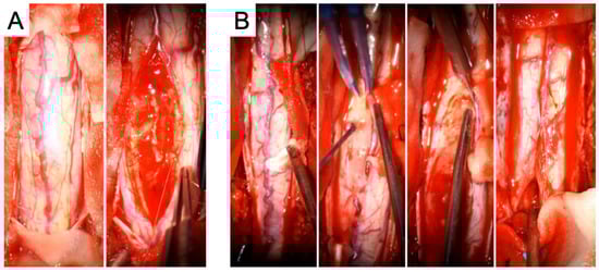 Intraoperative images from the first tumor resection (A) and the second tumor resection (B). In (A), the initial view of the spinal cord is shown, followed by the macroscopic morphology of the tumor. In (B), the surgical strategy is illustrated in greater detail: first, the exposure of the spinal cord is shown, followed by a macroscopic view of the tumor and preparation of the tumor–spinal cord interface, which is also depicted in the subsequent imaging. Finally, closure of the spinal cord by arachnoid suturing after complete tumor resection is demonstrated.