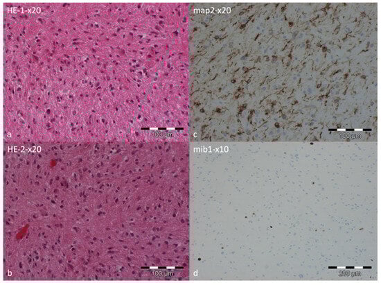 Histopathological examination of the tumor specimen. Hematoxylin and eosin staining at low magnification showing slightly to moderately cellular astroglial tumor tissue with minimal pleomorphism. Tumor cells exhibit partly bipolar processes, and occasional Rosenthal fibers are noted. Focal areas of small vascular proliferations are present (a,b). The neuronal differentiation marker MAP2 was expressed in a subset of tumor tissue, highlighting axon-bearing tumor cells (c). The proliferation marker MIB1 indicated approximately 3% immunopositive nuclei (d).