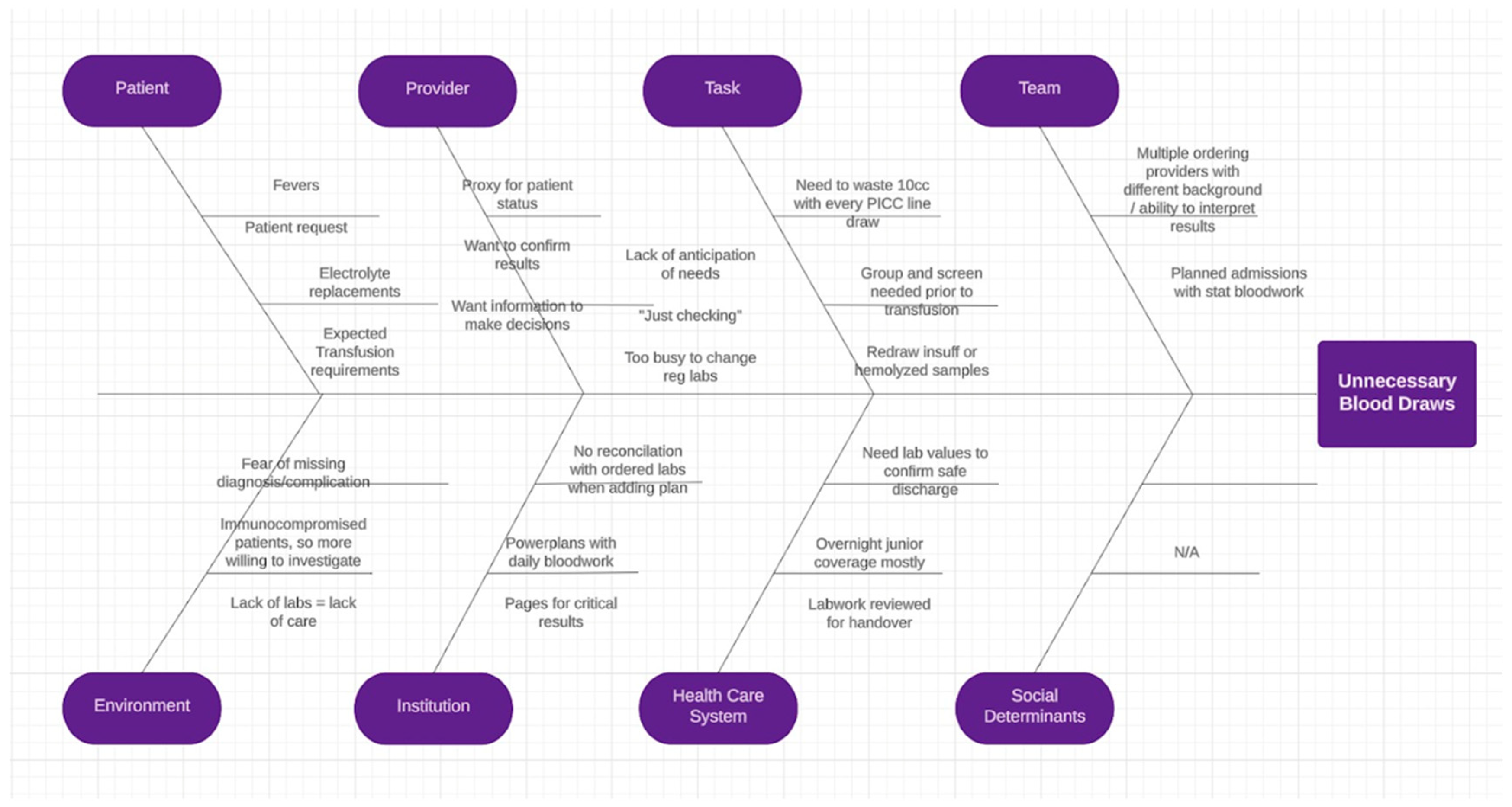 Methods: We primarily followed the Model for Improvement QI Methodology and a modified version of the Model for Understanding Success in Quality Improvement. We identified patients who underwent ASCT from the LHSC database to collect baseline data on blood draw volumes and cost of tests during admissions. We determined average blood volume collected for patients, iatrogenic blood draw and cost. Average nursing time was determined via direct observation of blood collections. Additional electrolyte infusions and blood transfusions were also calculated. Finally, we completed a root cause analysis using an Ishikawa Fishbone Diagram (