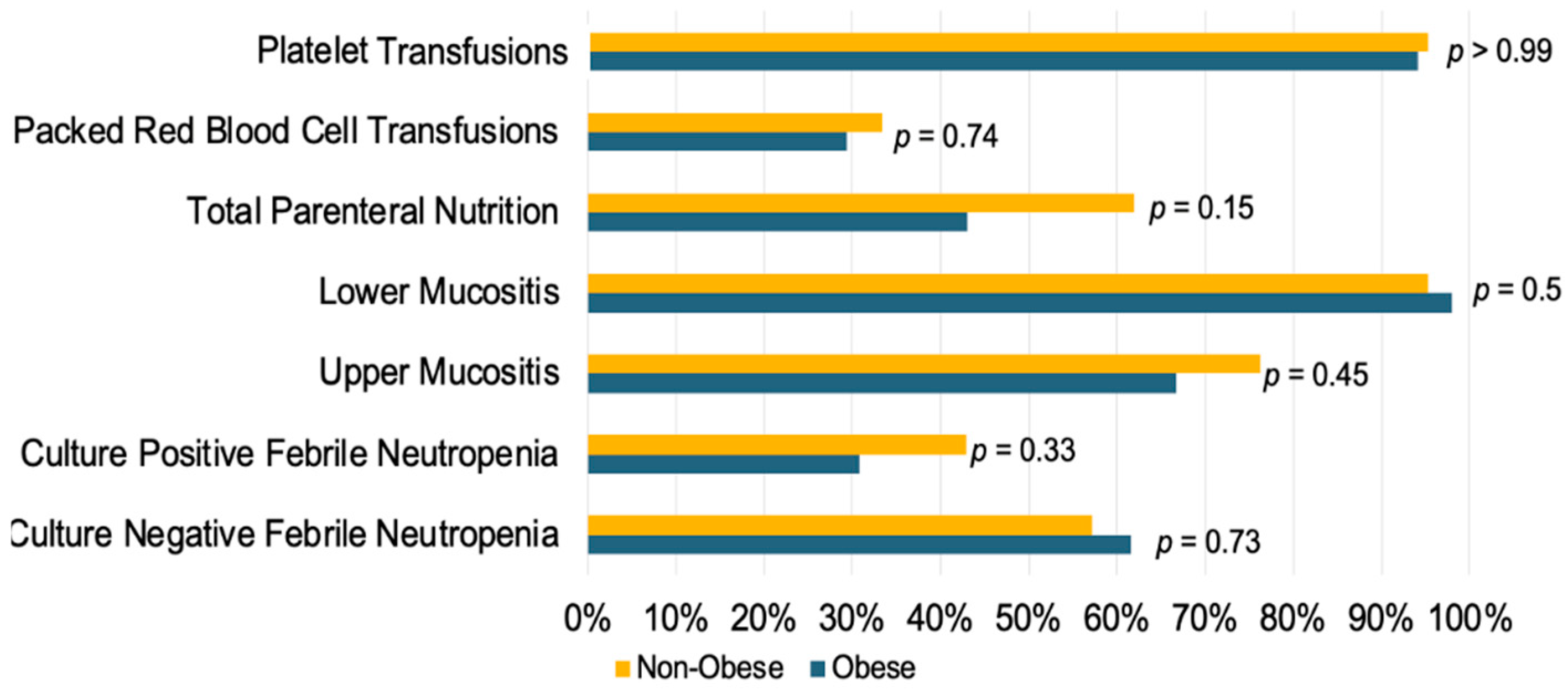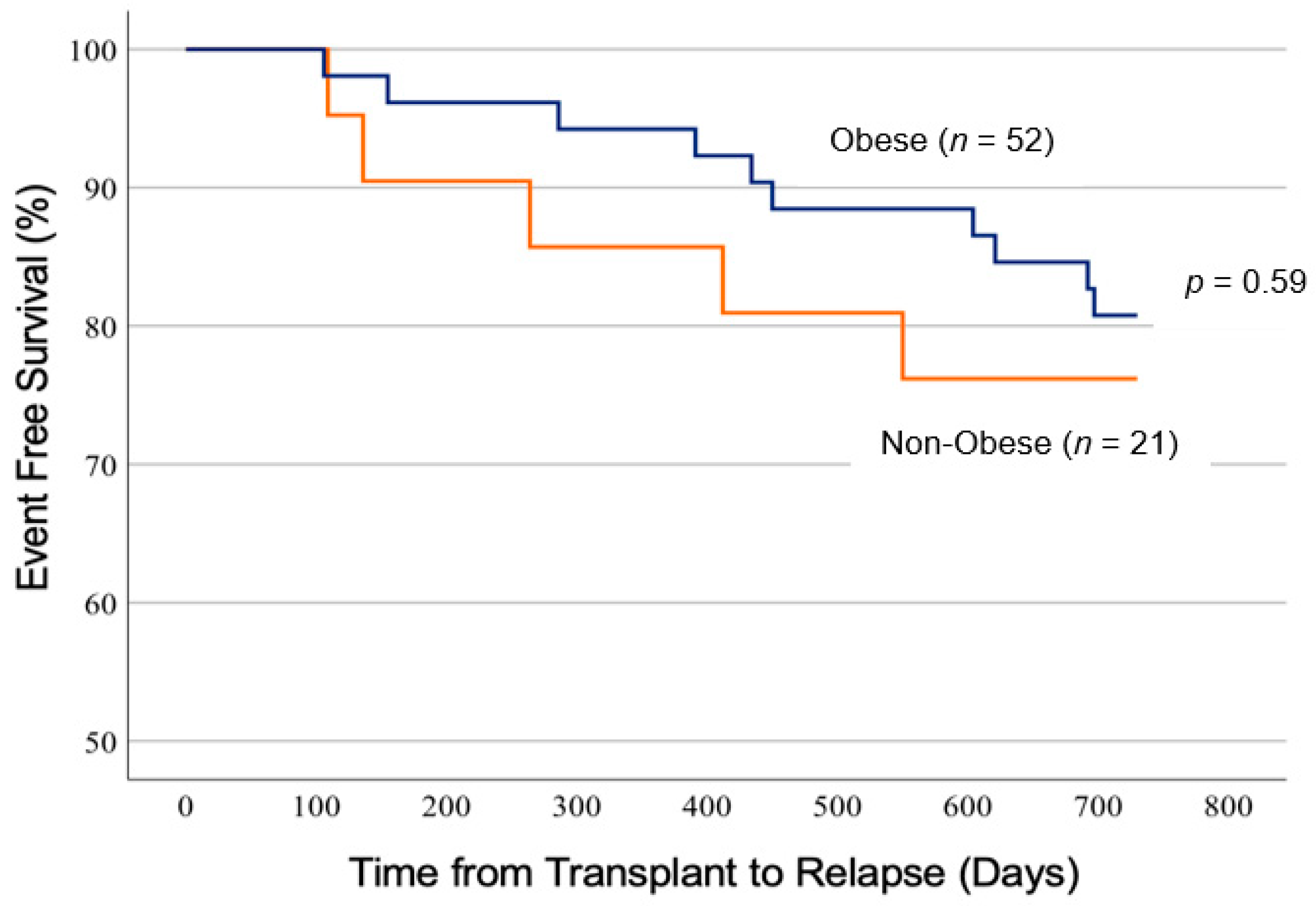 Methods: A retrospective chart review was completed for MM patients undergoing ASCT from 1 January 2018 to 31 May 2021. Obese and non-obese patients who received melphalan chemotherapy prior to autologous transplant were included. Obese patients were defined as being greater than 120% above ideal body weight and having received 40% adjusted body-weight-based melphalan dosing. Data regarding transplant, including safety outcomes, and relapse within 2 years post-ASCT were collected.
