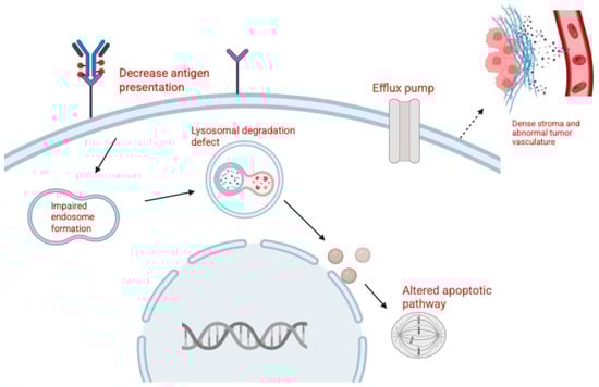 Resistance to ADCs such as EV and SG is a major challenge in the treatment of urothelial carcinoma. Tumor cells can escape ADC therapy through alterations in the target antigen, reduced sensitivity to the cytotoxic payload, changes in drug transport, or impaired intracellular processing (Figure 2). Broader factors, including tumor heterogeneity and the tumor microenvironment, also contribute to resistance [49].