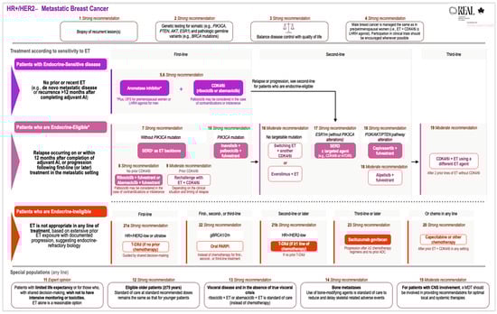 Recommendations herein are arranged according to the line of therapy for metastatic HR+/HER2− breast cancer; however, treatment decisions should consider both disease biology and patient-specific factors (e.g., disease burden, symptoms, comorbid conditions, functional status, preferences, and values). Clinical decisions should remain individualized rather than dictated by rigid, predefined sequencing restrictions. Incorporation of patient preferences and values is essential. Shared decision-making should be broadly employed to ensure that patients understand the risks/benefits of proposed therapies and the relevant monitoring requirements, which must align with their treatment goals and preferences. The ESMO Magnitude of Clinical Benefit Scale (ESMO-MCBS) version 2.0 score, which indicates the magnitude of clinical benefit for recommended therapies, is presented where applicable (https://www.esmo.org/guidelines/esmo-mcbs/esmo-mcbs-for-solid-tumours/esmo-mcbs-scorecards, accessed on 13 January 2026).