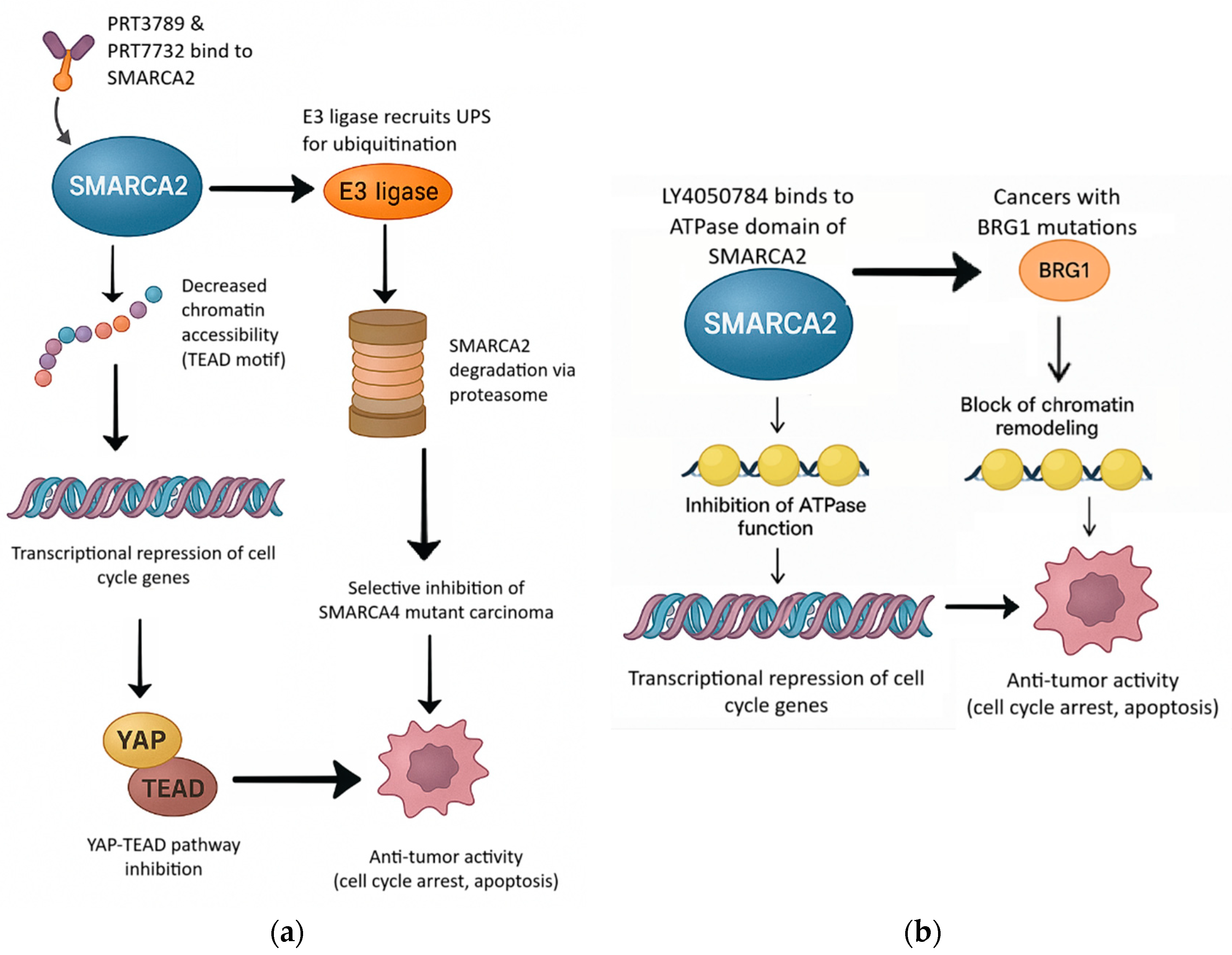- Ito, K.; Hulse, M.; Agarwal, A.; Carter, J.; Sivakumar, M.; Vykuntam, K.; Wang, M.; Cowart, M.; Cote, J.; Gowen-MacDonald, W.; et al. Abstract B113: Discovery of PRT3789, a first-in-class potent and selective SMARCA2 degrader in clinical trials for the treatment of patients with SMARCA4 mutated cancers. Mol. Cancer Ther. 2023, 22, B113. [Google Scholar] [CrossRef]