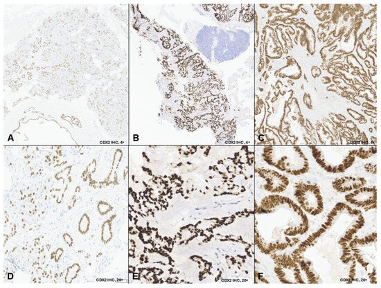 In malignancy, CDX2 is most prominently expressed in colorectal adenocarcinomas, where more than 90% of cases show nuclear positivity [12], establishing it as a sensitive diagnostic marker of colorectal origin [13,14]. However, CDX2 expression is also found in gastric [15,16] and pancreatobiliary adenocarcinomas [17], and even in tumors arising outside the GI tract, including those of the sinonasal tract [18], lung [19,20], ovary [21], prostate [22], and bladder [23]. This distribution indicates that CDX2 reflects a broader enteric differentiation program rather than a strictly site-specific phenotype.
