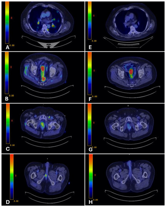 PET-CT imaging before and after fluoropyrimidine-based therapy in Case 1. Legend: Representative PET-CT images demonstrate FDG-avid disease at multiple sites before therapy and the response after fluoropyrimidine-based treatment. Pre-treatment (Panels (A–D)): FDG-avid disease involving bilateral lungs (A), presacral pelvic mass (B), pelvic lymph nodes (C), and right penile crus (D). Post-treatment (Panels (E–H)): Restaging PET-CT images show complete metabolic response at all previously involved sites, with resolution of FDG uptake (E–H).