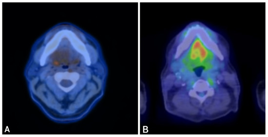 PET-CT imaging before and after fluoropyrimidine-based therapy in Case 2. Legend: Representative PET-CT images demonstrating disease before therapy and response after fluoropyrimidine-based treatment. Pre-treatment (A): FDG-avid right cervical lymphadenopathy and mild asymmetric uptake in the right palatine tonsillar region. Post-treatment (B): Restaging PET-CT demonstrates resolution of metabolic activity, with decreased enhancement at the primary site and marked reduction in cervical nodal size, consistent with a complete metabolic response.