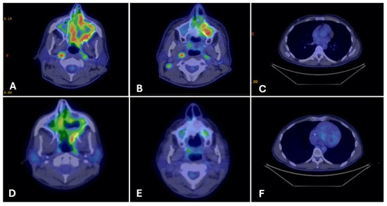 PET-CT imaging before and after fluoropyrimidine-based therapy in Case 3. Legend: Representative PET-CT images show FDG-avid disease at multiple sites before therapy and the response after fluoropyrimidine-based treatment. Pre-treatment (Panels (A–C)): FDG-avid disease involving the left maxillary sinus mass (A), right cervical lymph nodes (B), and right pulmonary nodules (C). Post-treatment (Panels (D–F)): Restaging PET-CT images demonstrate remarkable partial metabolic response at all previously involved sites, with reduction in FDG uptake and lesion size (D–F).