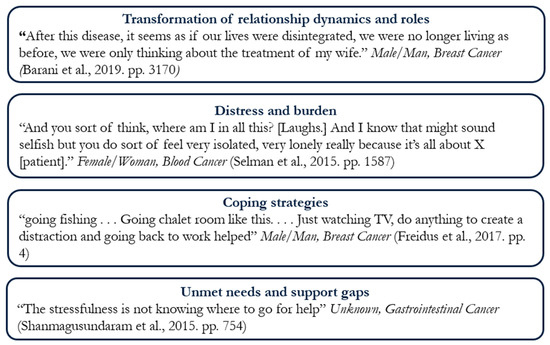 Drawing on themes reported across the included studies, we synthesized four themes that captured the lived experiences of partners of patients with cancer: (1) transformation of relationship dynamics and roles, (2) distress and burden, (3) coping strategies, and (4) unmet needs and support gaps. Collectively, these synthesized themes captured the multifaceted nature of partners’ experiences in the context of cancer, highlighting how they adapt to emotional, relational, and practical changes across the illness trajectory (e.g., Figure 2).