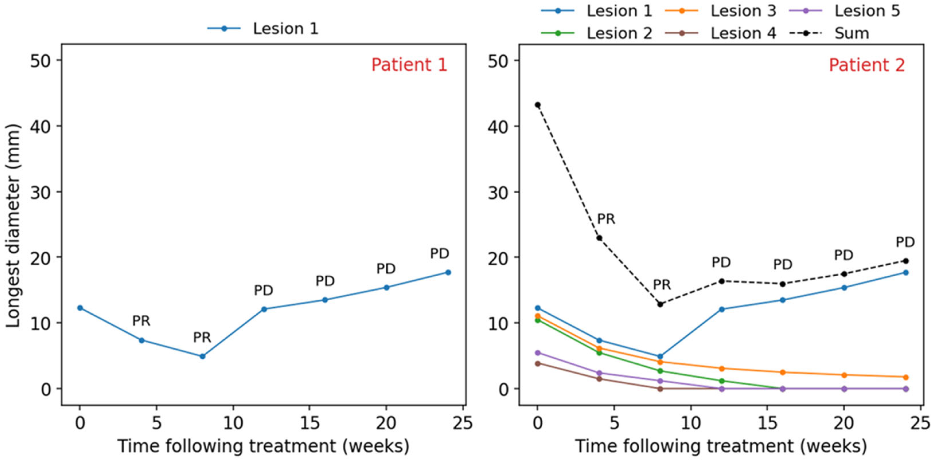 | Target lesions | None | ≥30% ↓ in SLD relative to baseline | Not PR, not PD | ≥20% ↑ in SLD and ≥5 mm ↑ in ≥1 LD relative to nadir |