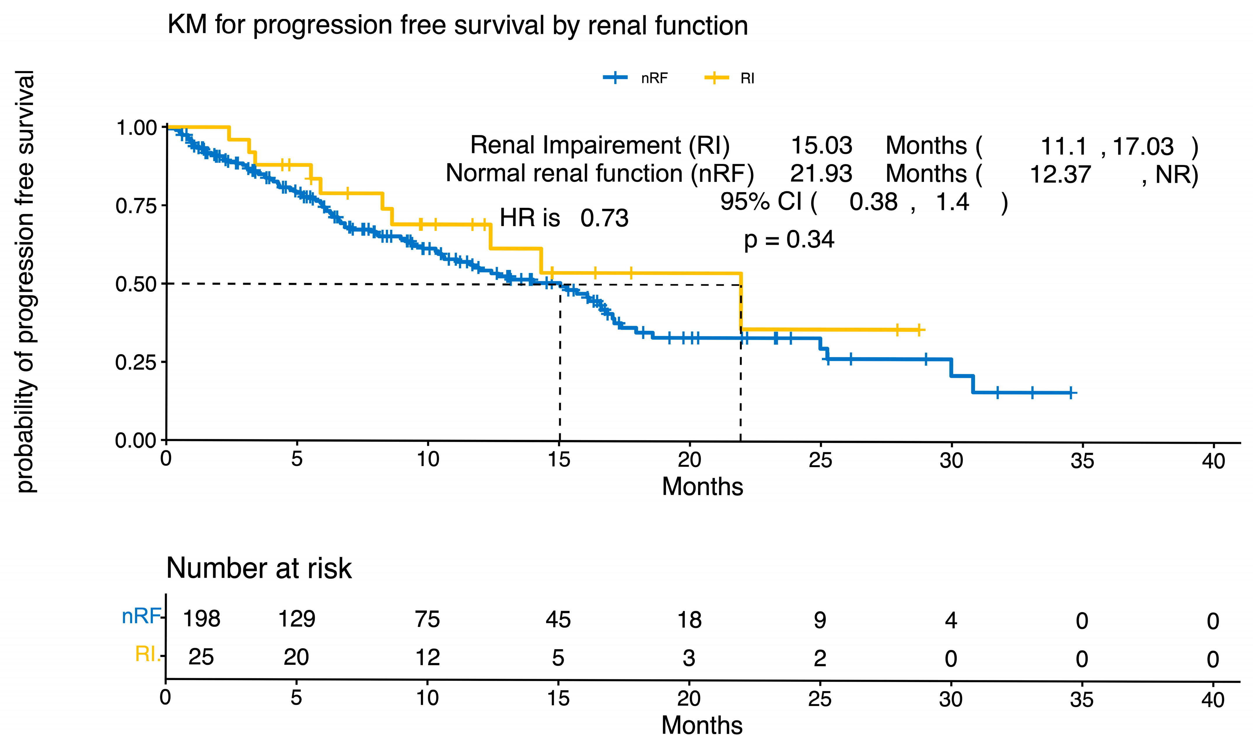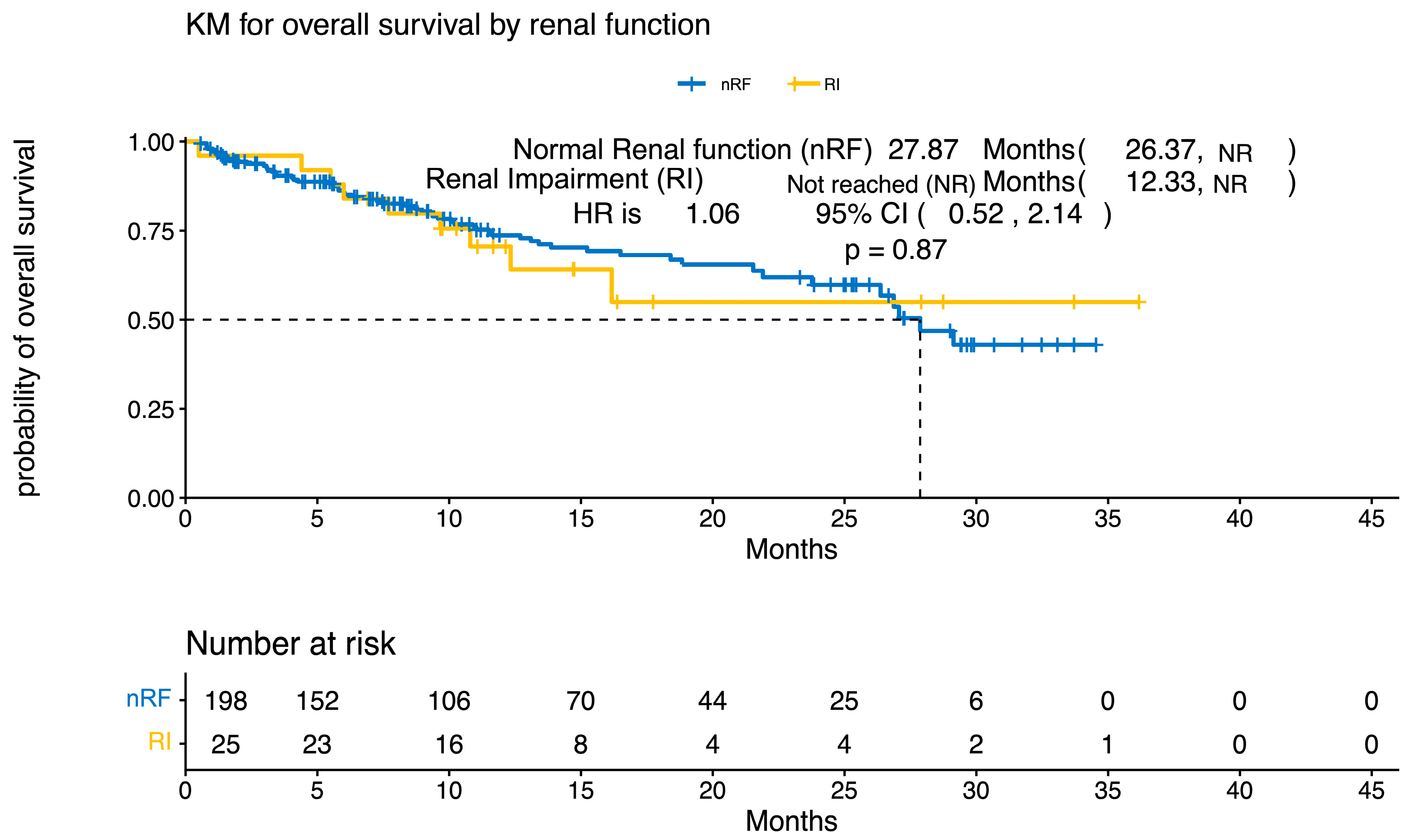 | Patient and Disease Characteristics | Normal Renal Function (n = 198) | Baseline Renal Impairment (CrCl < 45 mL/min; n = 25) | p-Value |