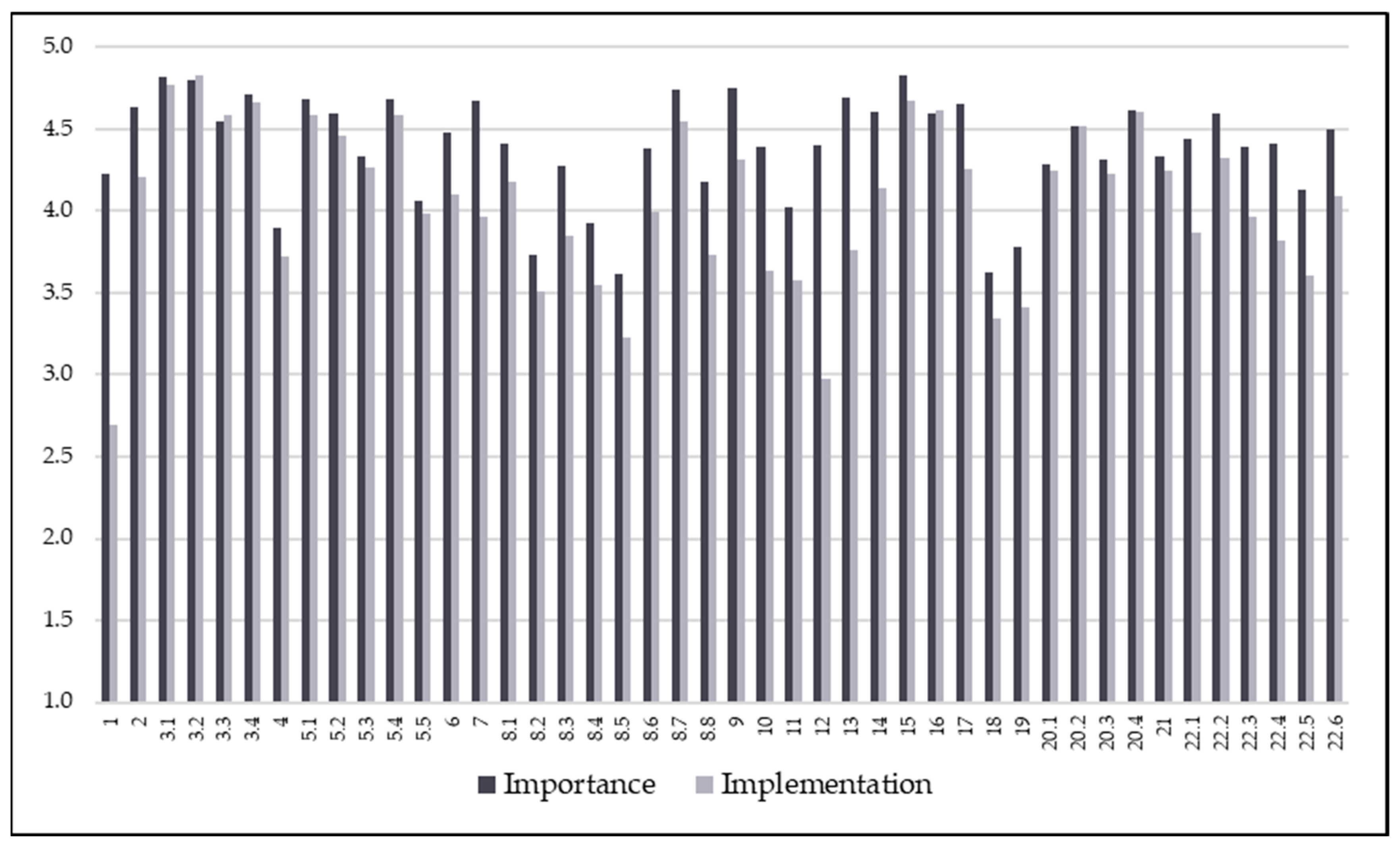 3.2. Importance and Implementation Levels
