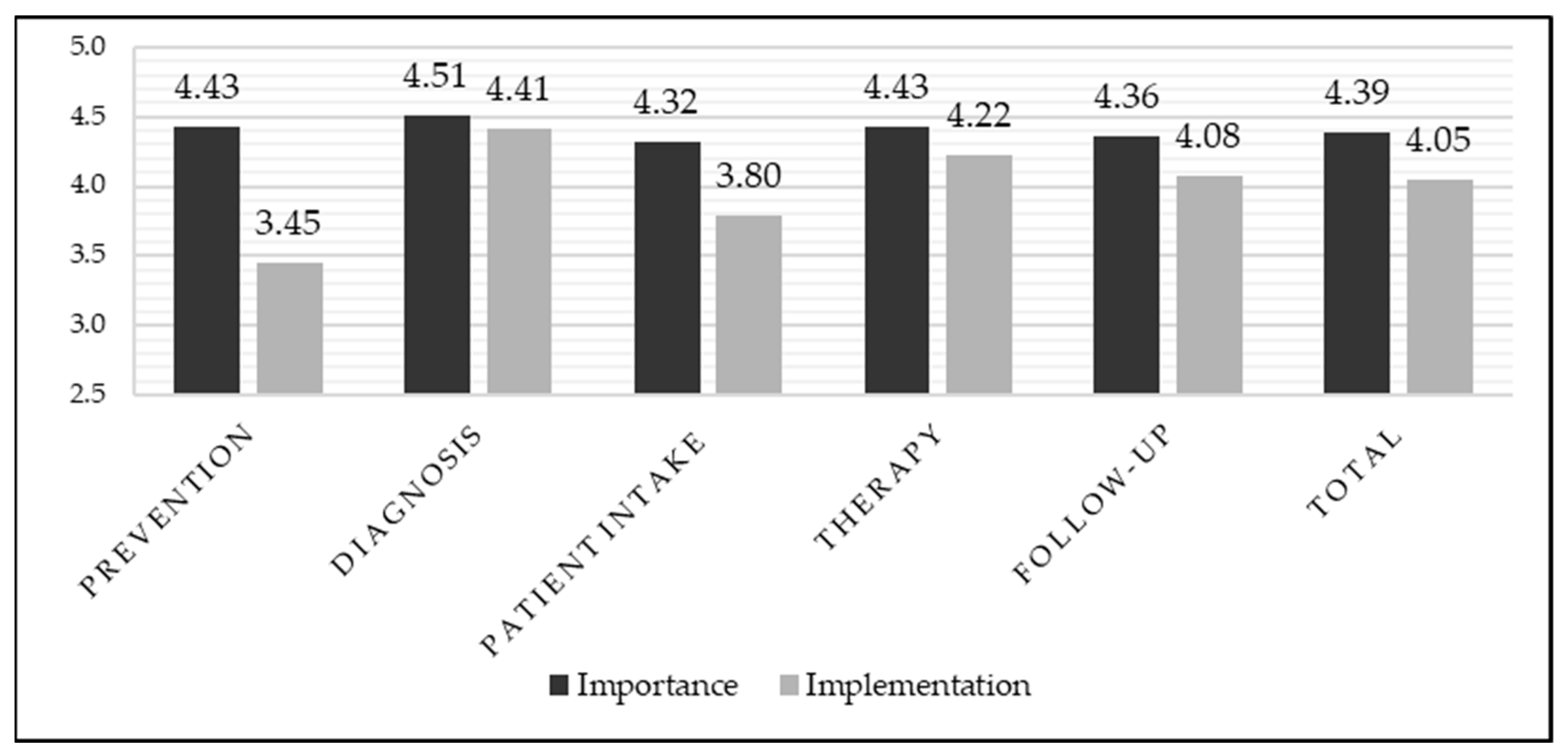 - In order to identify items that may require additional efforts or targeted programs, the difference between perceived importance and reported implementation was examined. For the purpose of emphasizing the findings, a discrepancy greater than 0.75 was arbitrarily defined as indicating a substantial critical issue in the implementation of the statements. In contrast, discrepancies between 0.25 and 0.75 were indicated as less severe concerns.