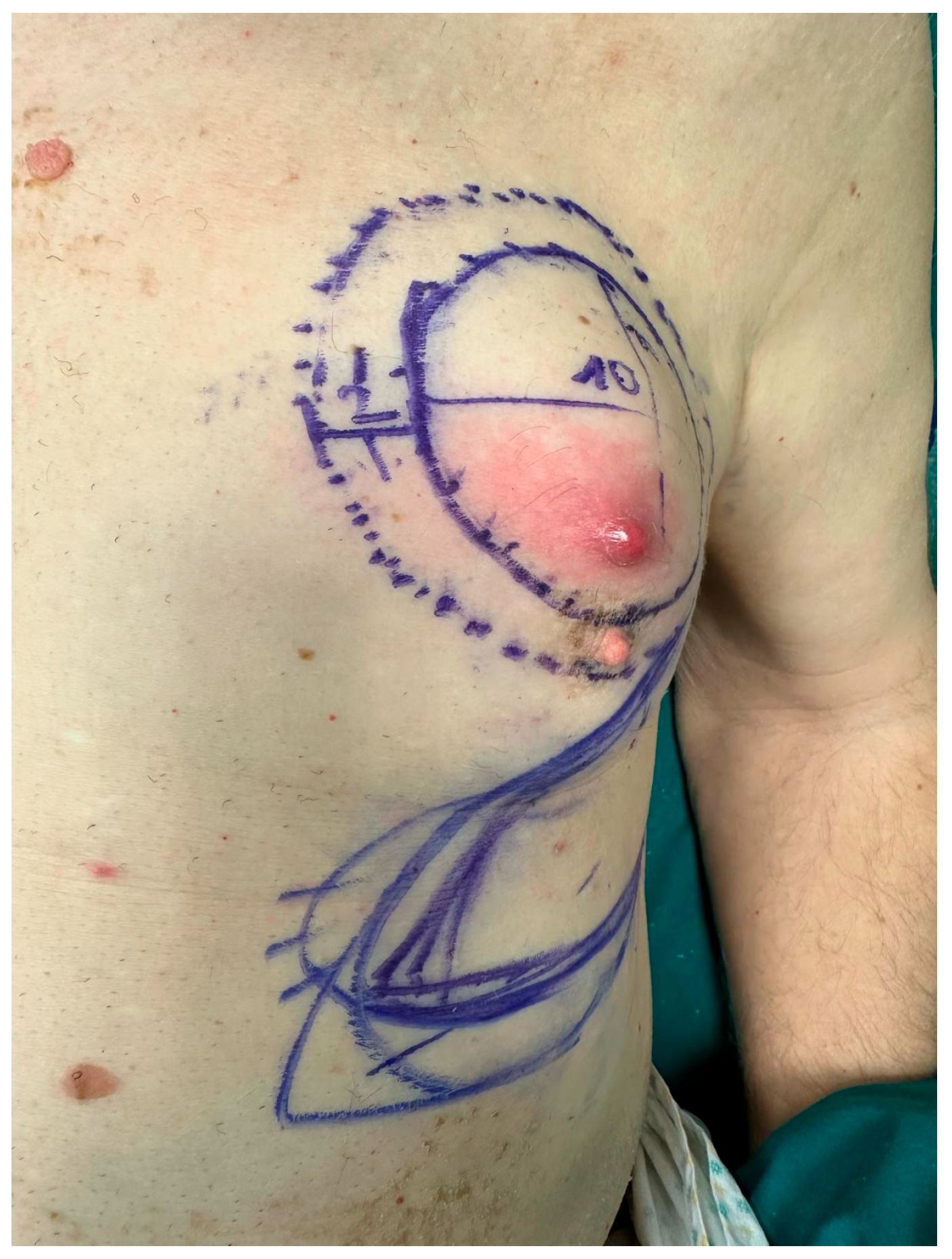 Figure 1). The patient underwent resection of the nipple–areolar complex and partial excision of the pectoralis major muscle. Reconstruction was performed using a thoracoepigastric fasciocutaneous flap, selected to achieve rapid and reliable wound closure and to allow early postoperative recovery and timely initiation of adjuvant therapy [