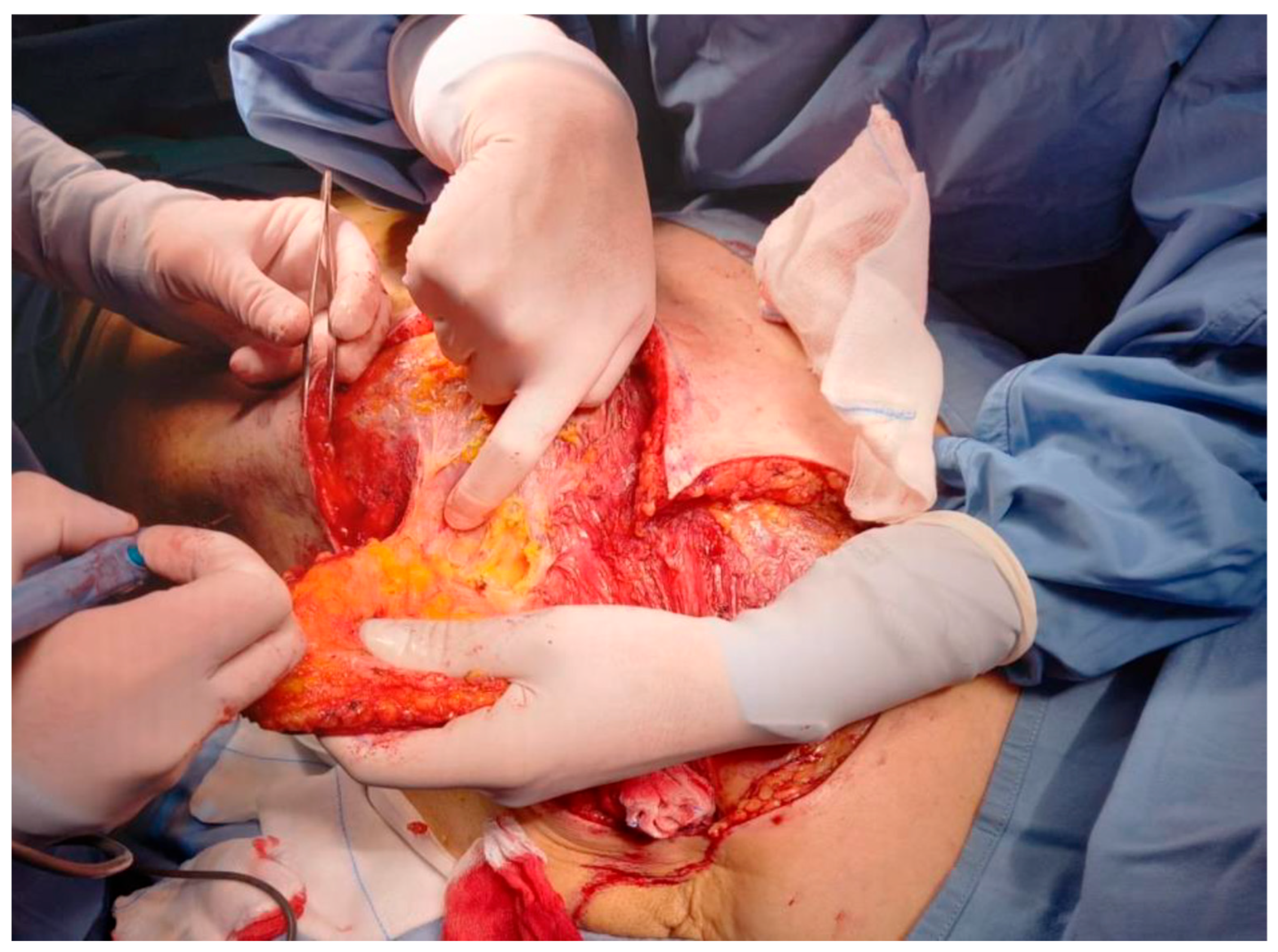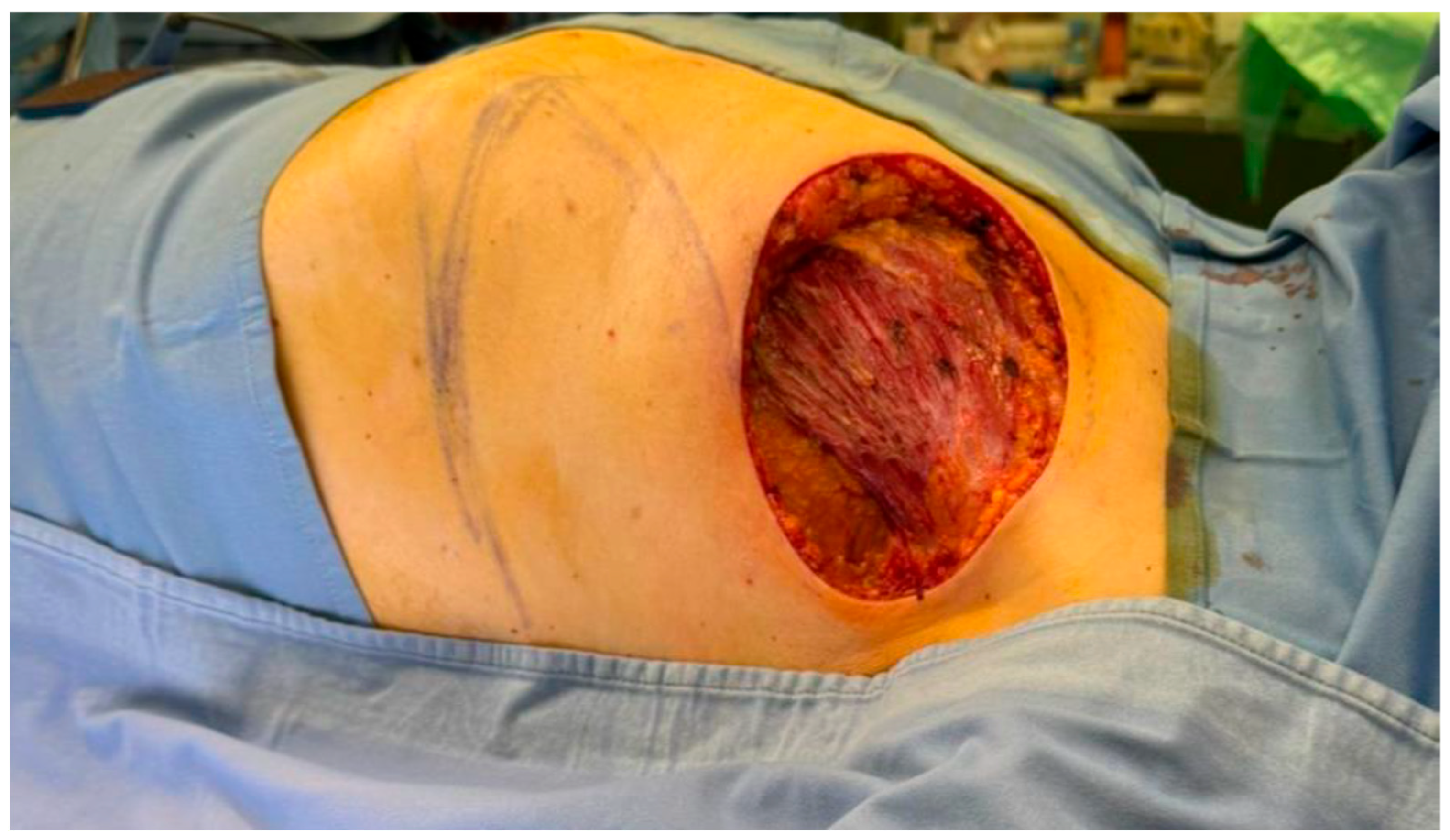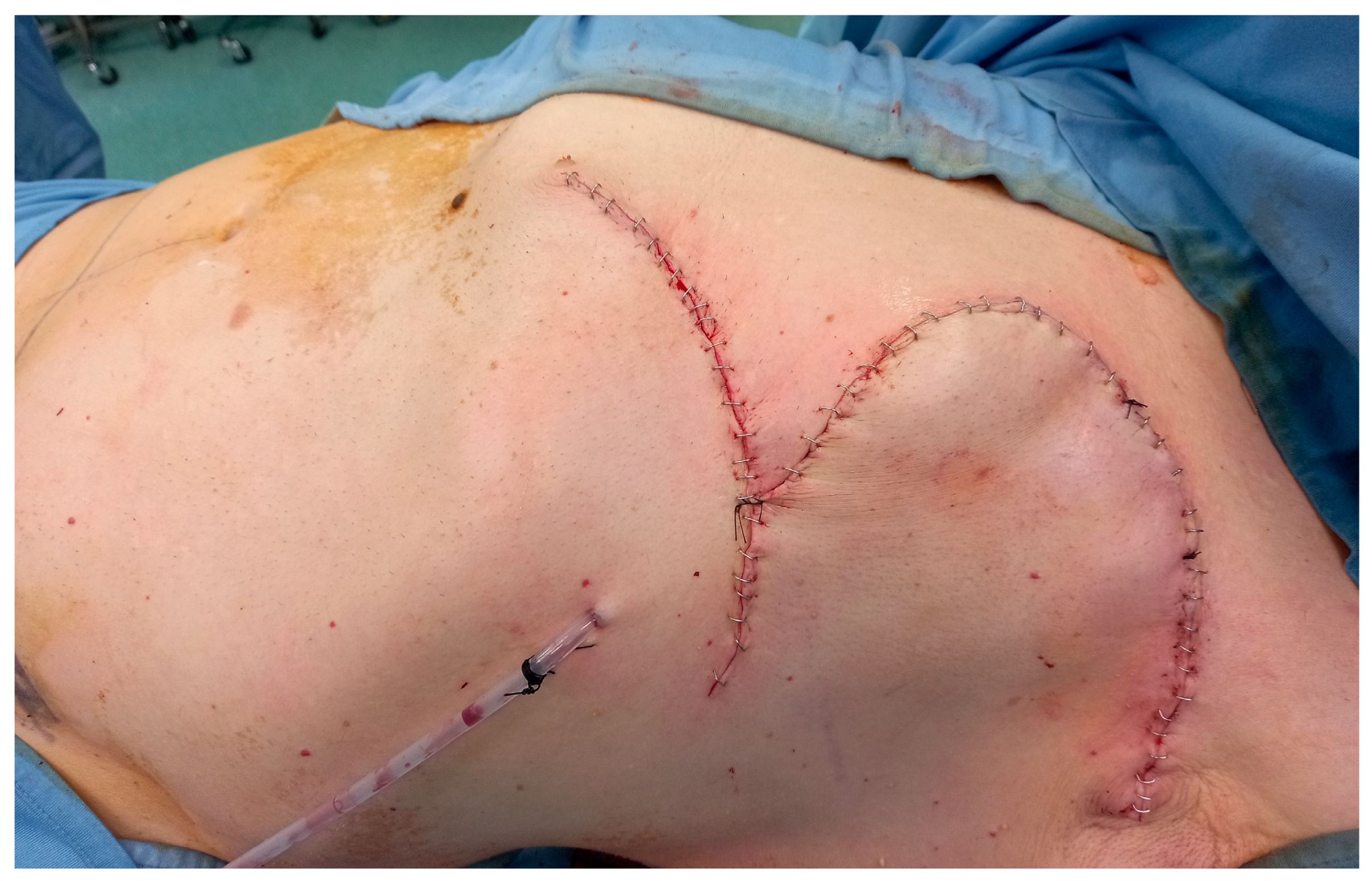 - Suryanarayana Deo, S.V.; Mishra, A.; Shukla, N.K.; Sandeep, B. Thoracoabdominal Flap: A Simple Flap for Covering Large Post-mastectomy Soft Tissue Defects in Locally Advanced Breast Cancer. Indian J. Surg. Oncol. 2019, 10, 494–498. [Google Scholar] [CrossRef]
