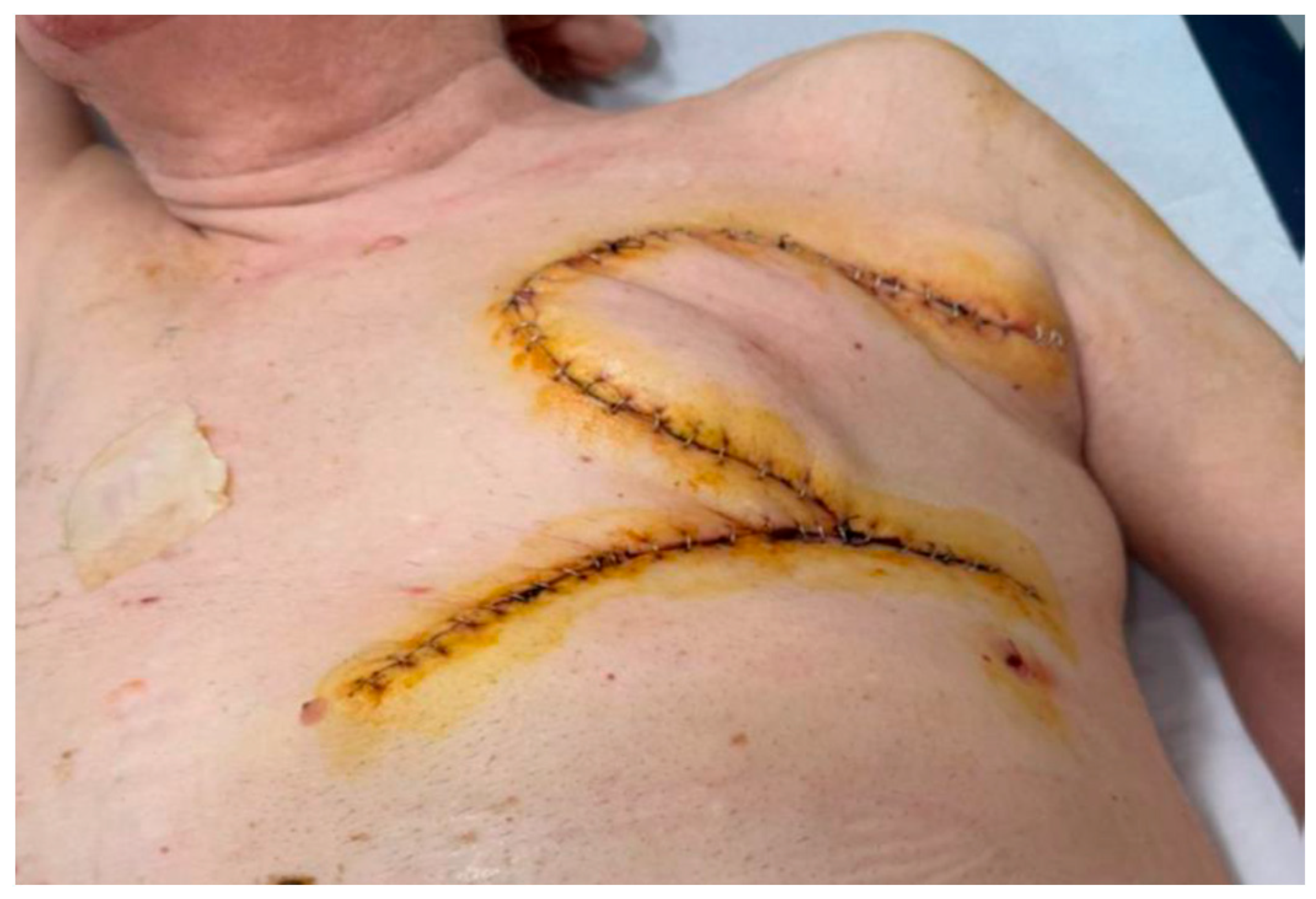 - Persichetti, P.; Tenna, S.; Cagli, B.; Scuderi, N. Extended cutaneous ‘thoracoabdominal’ flap for large chest wall reconstruction. Ann. Plast. Surg. 2006, 57, 177–183. [Google Scholar] [CrossRef] [PubMed]