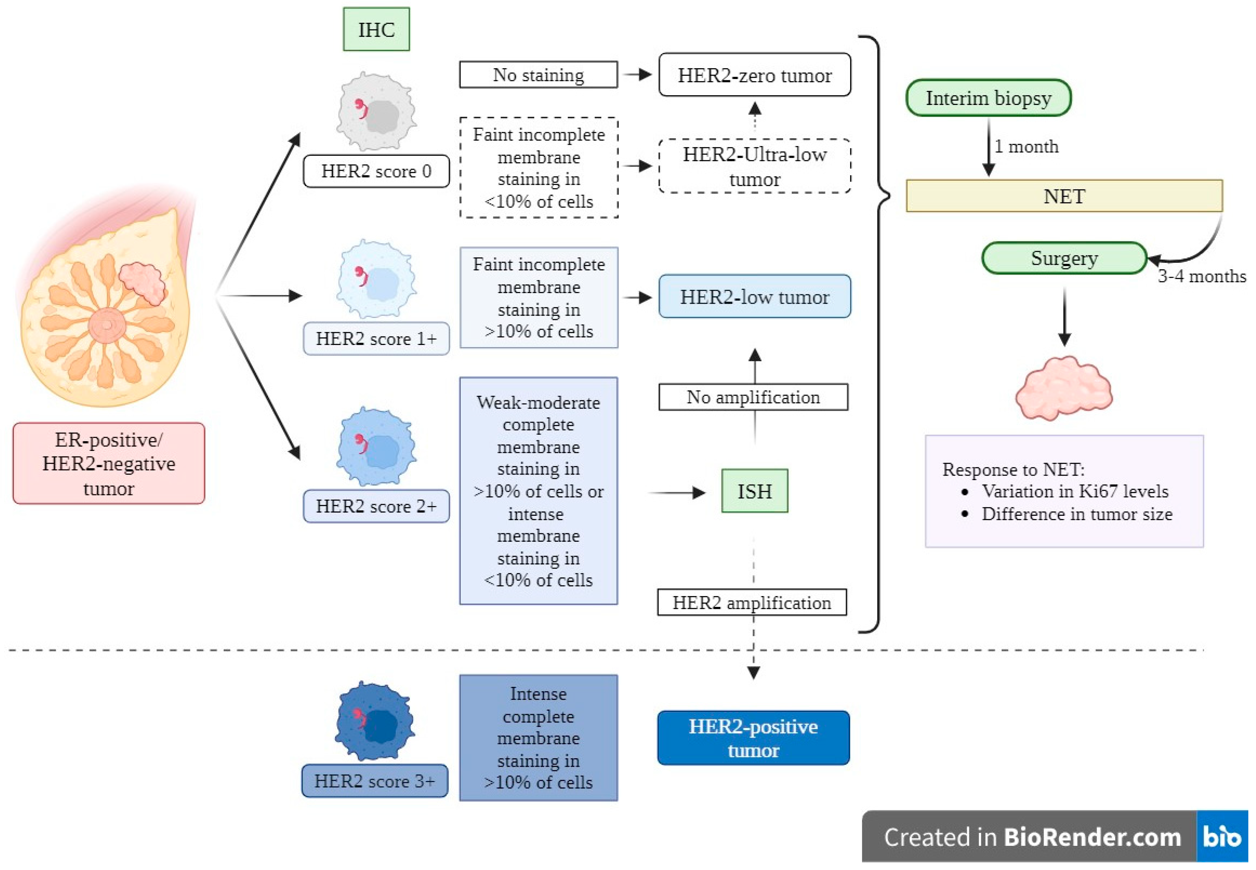 30] combined NET and neoadjuvant anti-HER2 targeted therapy in luminal HER2-positive breast cancer, with controversial results. Further studies with larger cohorts should be conducted to establish whether this could be a form of treatment for patients with luminal BC that overexpress HER2 protein to any extent, including HER2-low and HER2-positive tumors.