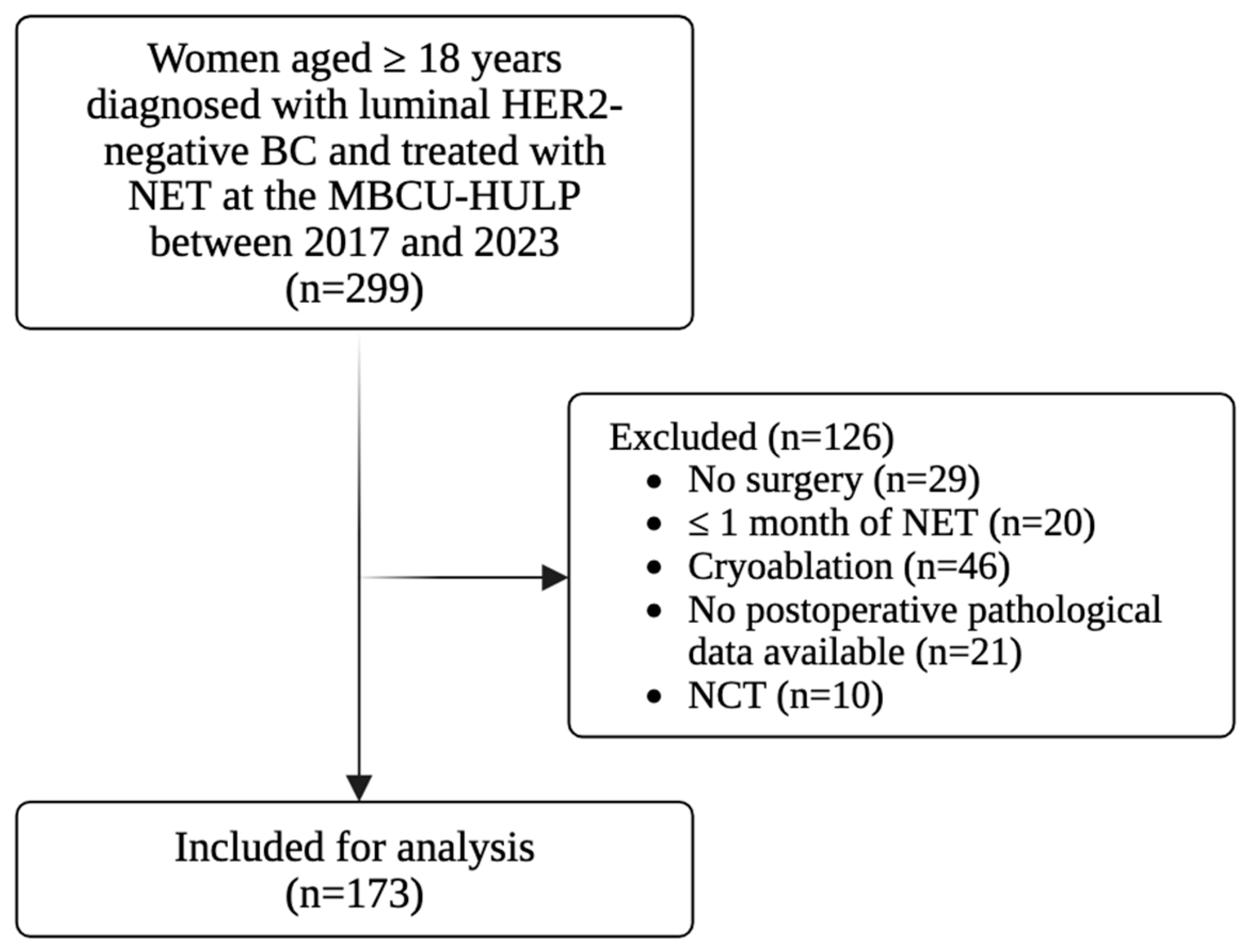 The study is a single-centered, retrospective, and observational investigation. Data were collected from the medical records of patients diagnosed with luminal HER2-negative breast tumors and treated with neoadjuvant hormonal therapy from 2017 to 2023. Inclusion criteria were as follows: (1) women aged 18 years and older; (2) diagnosed with luminal HER2-negative BC and treated with NET, as per evidence-based recommendations; (3) patients treated at the Multidisciplinary Breast Pathology Unit of the HULP between 2017 and 2023. Exclusion criteria included the following: (1) patients who did not undergo surgery, as postoperative pathological data were essential for the study endpoints, and neoadjuvant endocrine therapy inherently implies subsequent surgery; (2) patients who received less than one month of NET, typically due to institutional protocol (small tumor size warranting early surgery), patient preference for prompt operation, or recent enrollment before completing four weeks of therapy; (3) patients who underwent cryoablation procedure instead of surgery; (4) patients who had missing postoperative pathological data available (more than one measured variable); (5) patients who received neoadjuvant chemotherapy (NCT) (