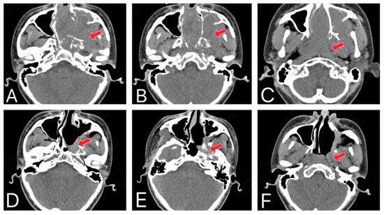 The invasive nature and recurrence of JNA. (A–C) CT shows that the original JNA originates from the posterolateral wall of the nasal cavity, near the pterygopalatine fossa region, and invades the surrounding bone. (D–F) The CT shows a recurrent JNA after surgery (The red arrow in the image indicates the lesion site).