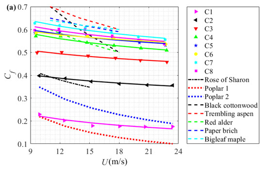 Figure 10a depicts relationships between drag coefficients and wind speed of the model for cases C1 to C8, in which the wind speed was converted into full scale according to velocity scale 1:2.45 [5], and other typical broad-leaved trees, including rose of Sharon [67], poplar trees [25], black cottonwood, trembling aspen, red alder, paper birch and bigleaf maple [68]. The drag coefficients for case C1 are 0.22 to 0.18 at wind speeds of 3.9 m/s to 9.3 m/s, while for case C2, the drag coefficients dramatically increase to 0.40–0.36 at the same wind speeds, which indicates that the crown frame greatly changes the aerodynamic shape of the model. The drag coefficients increase rapidly with increased numbers of leaf clusters (for cases C3 to C4) and tend to be steady when there are relatively more leaf clusters (for cases C5 to C8). The former is mainly caused by the initial increased number of leaves significantly changing the aerodynamic shape of the model, while the latter indicates that the aerodynamic shape of the model changes more slowly with more leaves. The variation of drag coefficients generally overlap those reported for the typical broad-leaved trees.