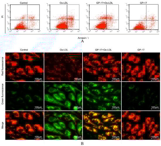 The induction of apoptosis in Ox-LDL-induced HUVECs was evaluated using Annexin V-FITC/PI staining assays and JC-1 staining. With Annexin V-FITC/PI staining, the results demonstrated that the number of early apoptotic cells was significantly increased in Ox-LDL-treated HUVECs compared with that of the control group. Incubation with GP-17 (50 μg/mL) significantly reduced the number of early apoptotic cells, while GP-17 alone did not significantly increase apoptosis of HUVECs compared with that of the control group (Figure 6A,C).