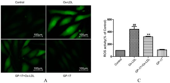 Ox-LDL-induced ROS generation in HUVECs activates apoptotic signaling. Therefore, we investigated the effects of GP-17 on the generation of ROS in HUVECs using H2DCFDA as a fluorescence probe. In the presence of 100 μg/mL Ox-LDL, ROS generation markedly increased compared with that of the control cells. However, incubation of HUVECs with GP-17 for 12 h before exposure to Ox-LDL markedly reduced the ROS generation (Figure 7A,B).