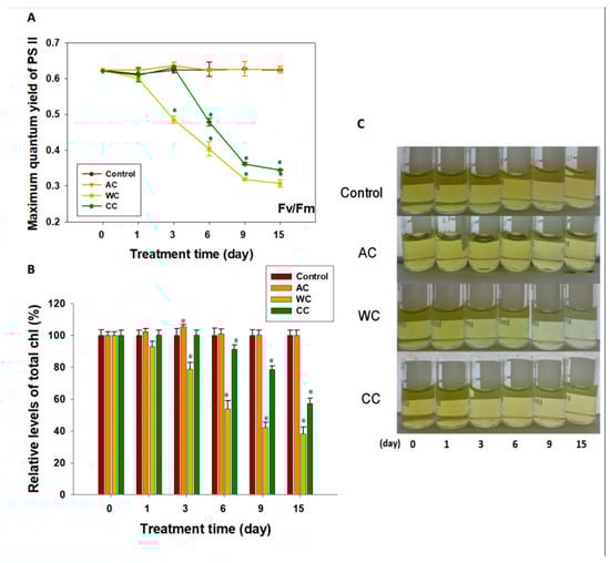 The maximum quantum yield of photosystem II (Fv/Fm) differed among the different treatments (Figure 1A). Acidification alone had no apparent deleterious effect on the photochemical efficiency of photosystem II (p > 0.05); indeed, we observed an upward trend in Fv/Fm values over the first 3 days, although the difference was not significant (p > 0.05) (Figure 1A). Similar results were observed in the CC group during the first 3 days. However, after 3 days of exposure in the CC group and 2 days in the WC group, the Fv/Fm values of both treatment groups decreased significantly (p < 0.05) (Figure 1A).