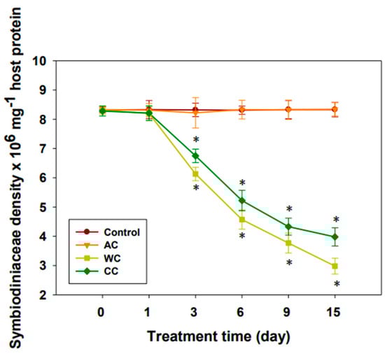 Consequences of different stresses on Symbiodiniaceae density (n = 3). AC, acidification conditions; WC, warming conditions; CC, combined conditions. Asterisks (*) indicate p-values < 0.05.