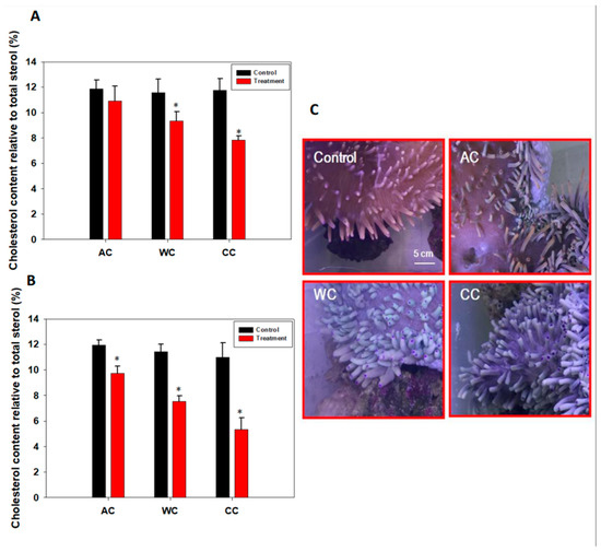 Results showed that sterol and cholesterol levels decreased from day 3 and were even lower on day 15 (p < 0.05) under CC and WC treatments (Figure 3A,B; Tables S2 and S3). Although there was no significant change in sterol metabolism in the AC group on day 3 (p > 0.05), it was significantly reduced at the end of the experiment (p < 0.05) (Figure 3A,B; Tables S2 and S3). In agreement with these findings, we found that the health of H. crispa was affected (Figure 3C) by acidification stress, although the photosynthetic apparatus and density of symbionts did not change significantly (Figure 1 and Figure 2). In addition, severe bleaching occurred under WC and CC treatments; the former was more severe, even though we did not detect the color score of the tentacles (Figure 3C).