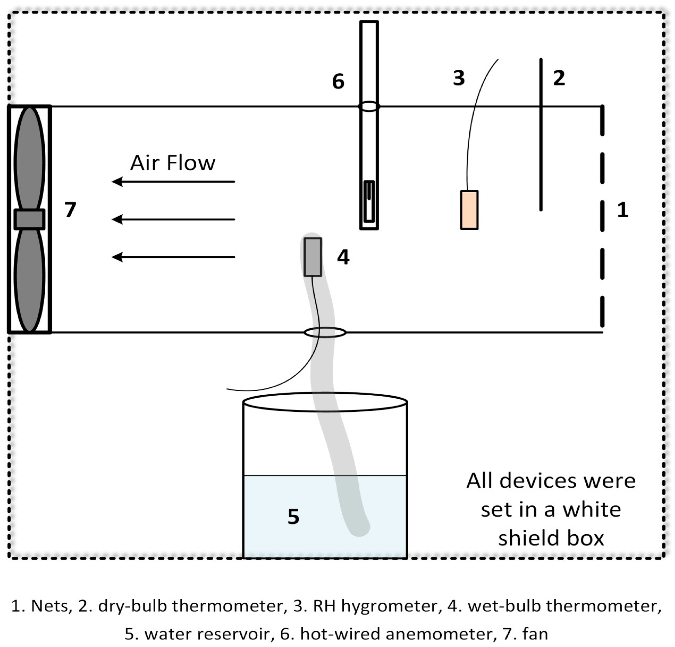 The air velocities were measured at several points to ensure the flow turbulence. Nets were used to filter particles and favoring the turbulence. The air velocity was adjusted by adjusting the fan speed. Air velocity was measured near the wet bulb thermometer by a hot-wired anemometer. A cotton wick 5 cm in length was attached to the wet bulb thermometer to maintain sufficient water to cool the sensor during aspiration. The measuring box was regularly maintained for each test. The wick must be clean and the de-ionized water was used as reservoir.